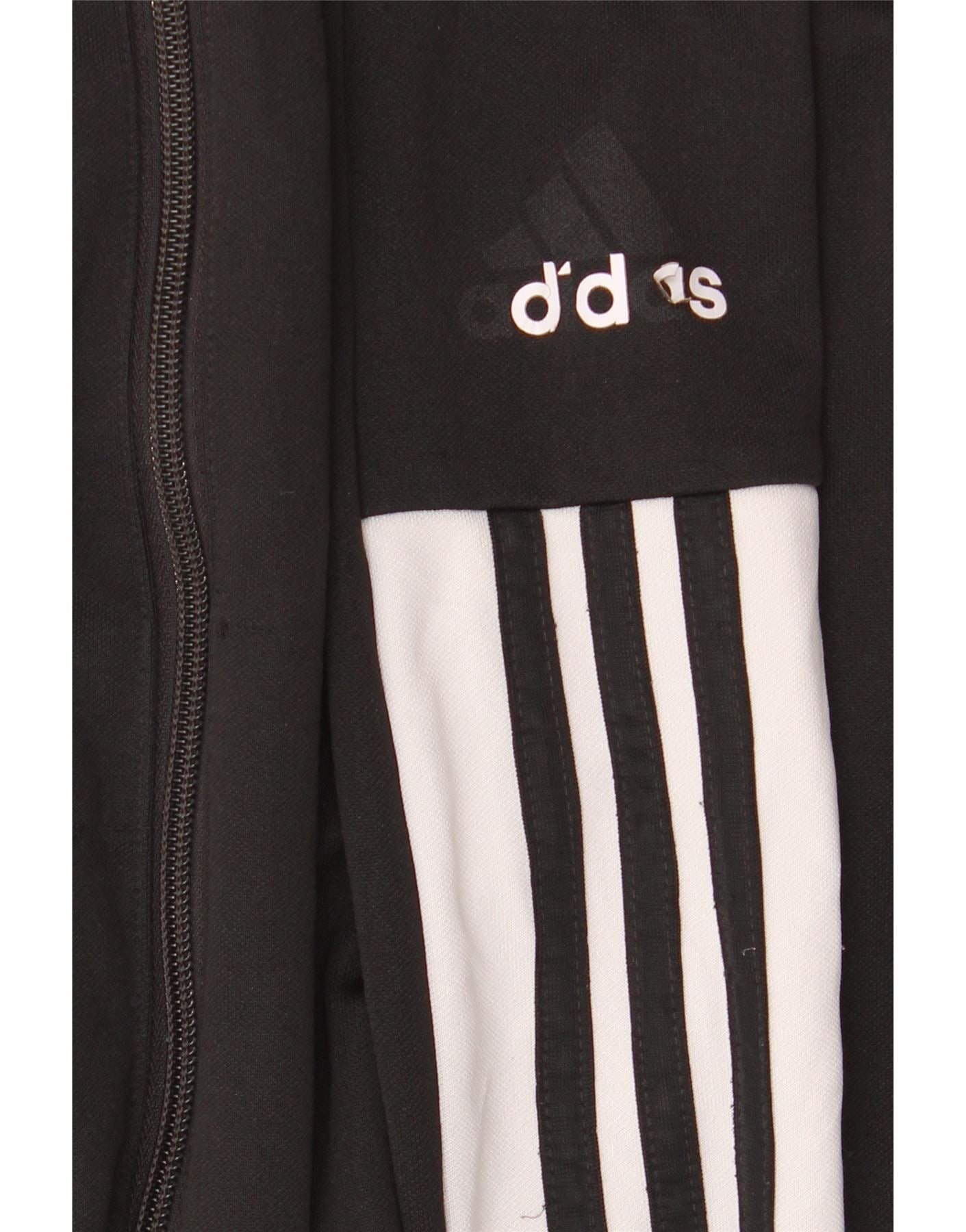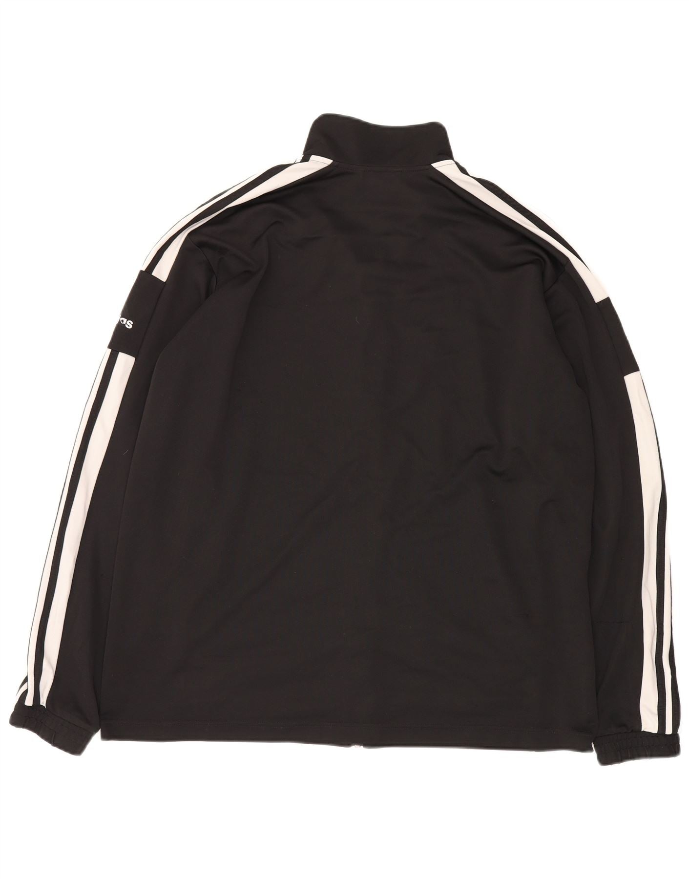 - Description de l'IA : Cette veste de survêtement Adidas pour homme est fabriquée à partir de tissu tissé en polyester recyclé noir. Il présente une encolure à col et une fermeture zippée complète. La coupe régulière assure un port confortable. Des rayures blanches ornent les manches longues, un détail classique d'Adidas. Un subtil accent de logo est présent. Il est respirant et comprend des poches pratiques, ce qui le rend idéal pour les vêtements de sport ou décontractés.