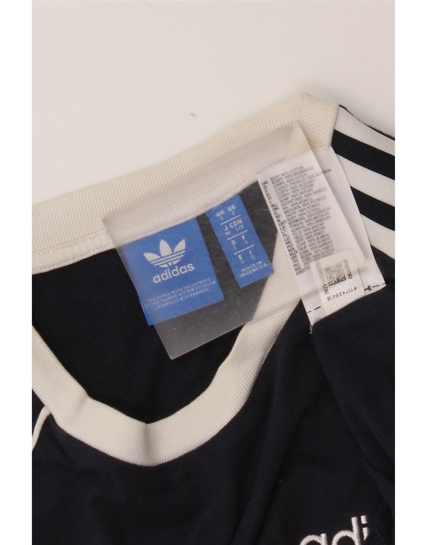 - Description de l'IA : Ce t-shirt graphique Adidas pour femme est confectionné en jersey de coton bleu marine doux. Il présente un col rond classique et des manches courtes raglan. Les trois rayures blanches emblématiques courent le long de chaque manche, complétées par une encolure et des poignets côtelés blancs. Un subtil logo Adidas est imprimé sur la poitrine. La coupe régulière assure confort et respirabilité au quotidien.