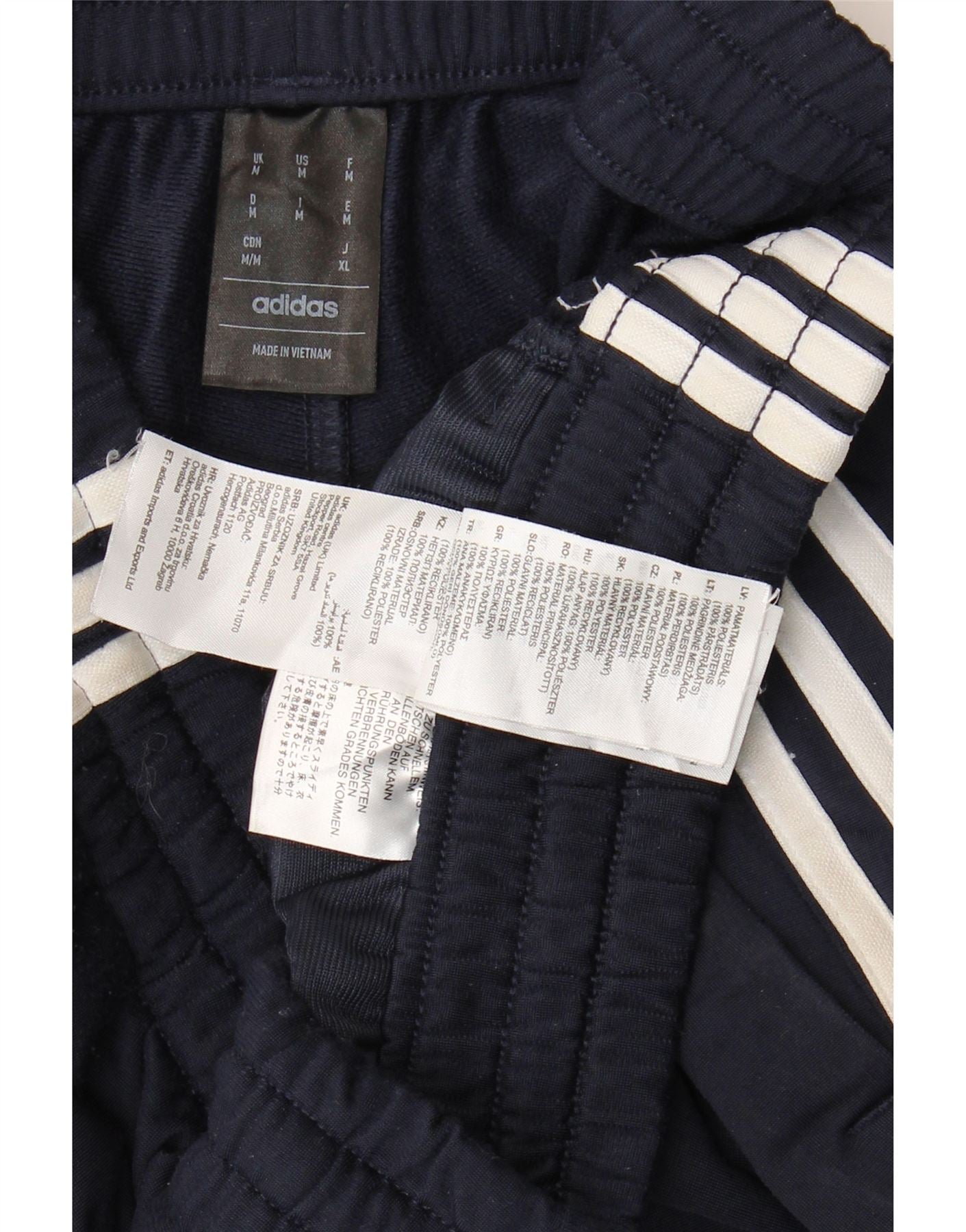 - Description de l'IA : Ce pantalon de survêtement Adidas pour homme est fabriqué à partir de tissu tricoté en polyester bleu marine lisse. Ils disposent d'une taille élastique confortable et d'une coupe régulière. Les jambes se rétrécissent jusqu'aux chevilles à revers. Trois bandes blanches classiques courent de chaque côté. Un subtil logo Adidas est placé sur la cuisse. Des poches pratiques sont incluses. Cette conception offre à la fois style et confort pour un port actif.
