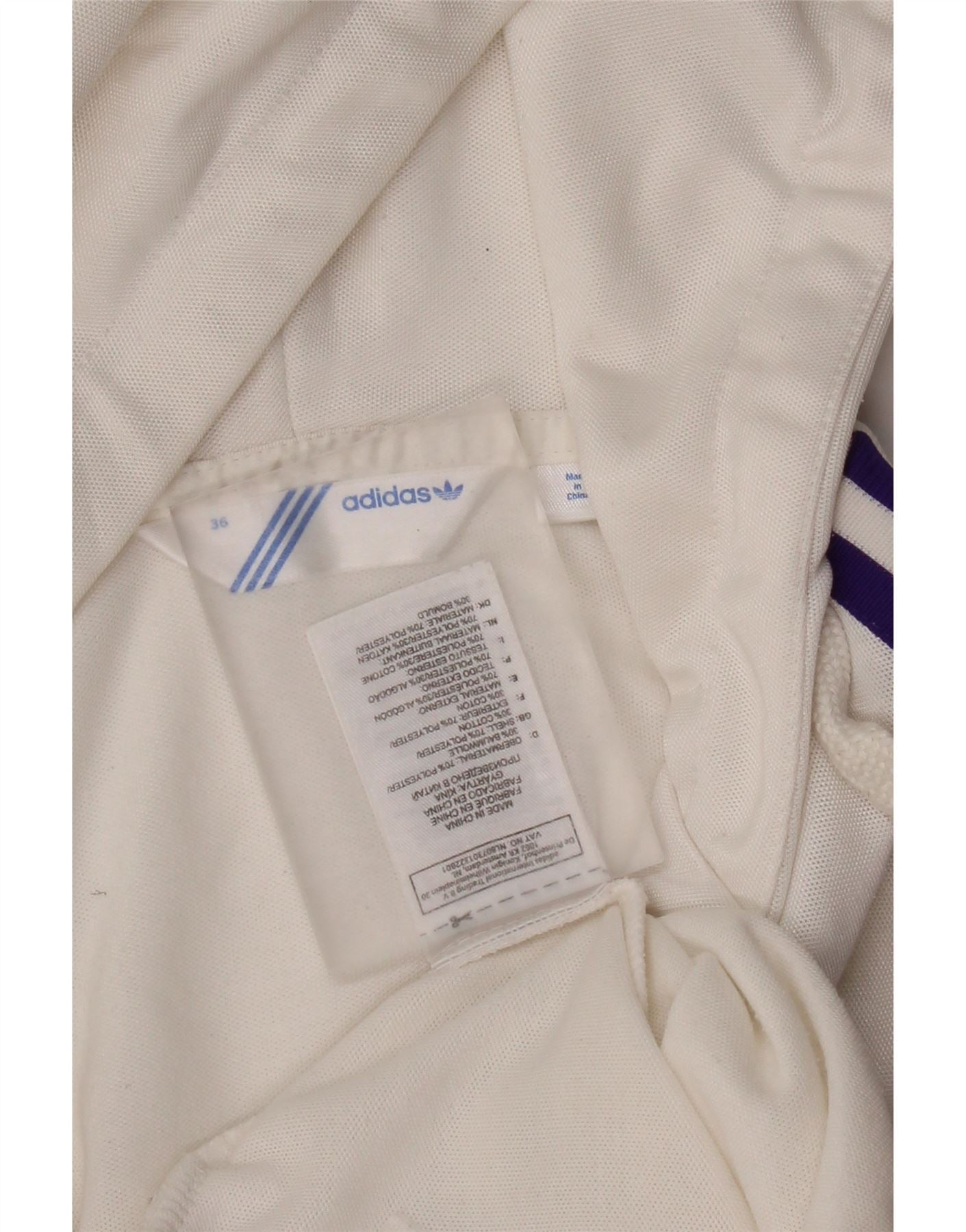 - AI Description: This Adidas womens Zip Hoodie Sweater is crafted from a soft off white cotton blend fleece fabric. It features a full zip closure and a comfortable hooded neckline. Long sleeves end in ribbed cuffs. Distinctive purple stripes adorn the sleeves, a signature Adidas detail. A small logo is present on the chest. Practical pockets complete the design. The regular fit ensures ease of movement, perfect for a sporty style.