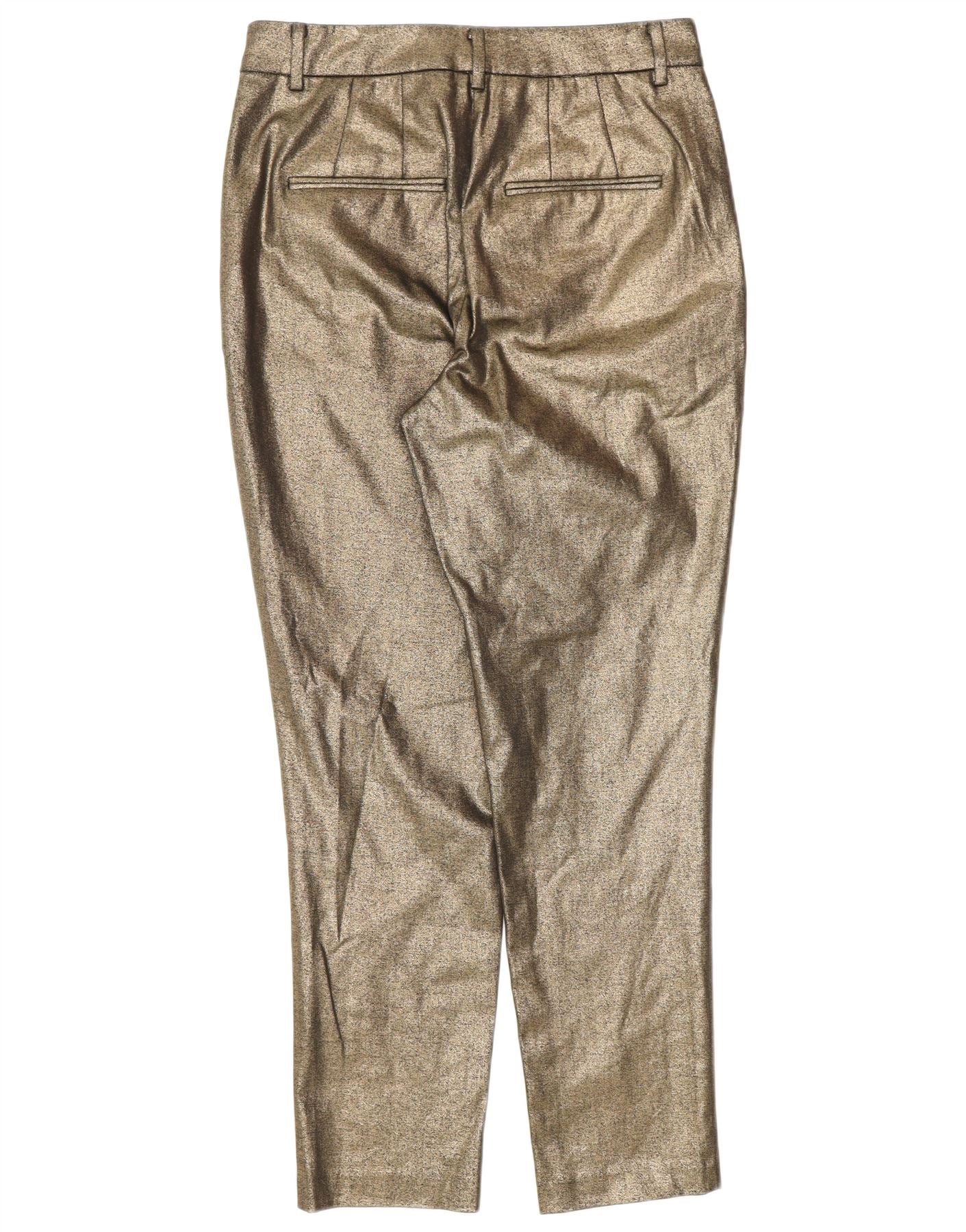- AI Description: These All Saints women's cropped trousers are crafted from a gold faux leather with a waxed finish. The woven fabric offers a structured yet supple feel. They feature a slim fit, tapering neatly to a cropped length. A zip closure creates a smooth front. Practical pockets add functional detail, completing this modern design.