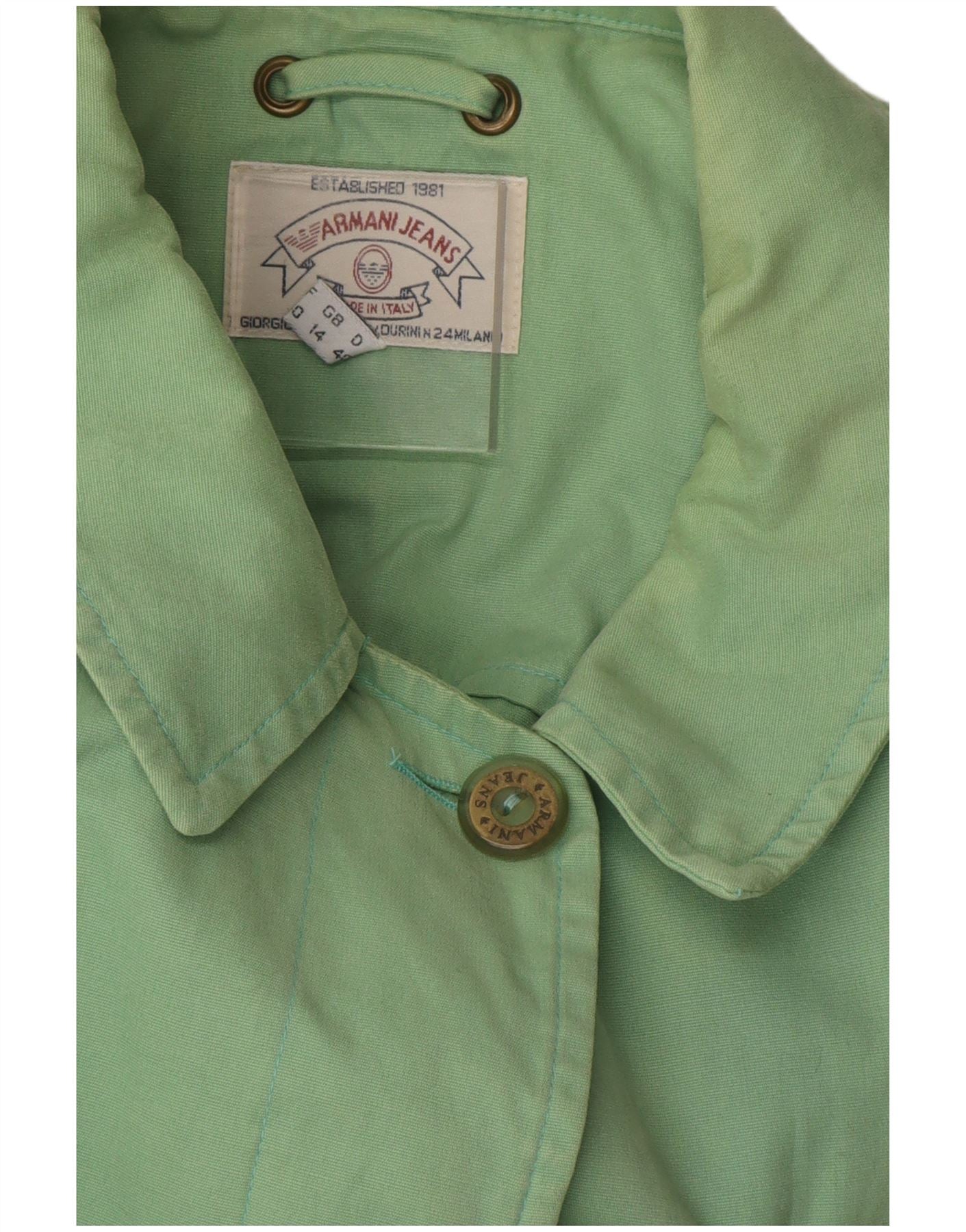 - Description de l'IA : Cet imperméable Armani Jeans pour femme est confectionné à partir d'un tissu vert lisse et tissé. Il présente une encolure classique et des manches longues. La coupe longue offre une couverture étendue. Une coupe régulière assure un port confortable. La fermeture boutonnée sur le devant est rehaussée de boutons ton sur ton. Les poches avant pratiques ajoutent des détails fonctionnels.