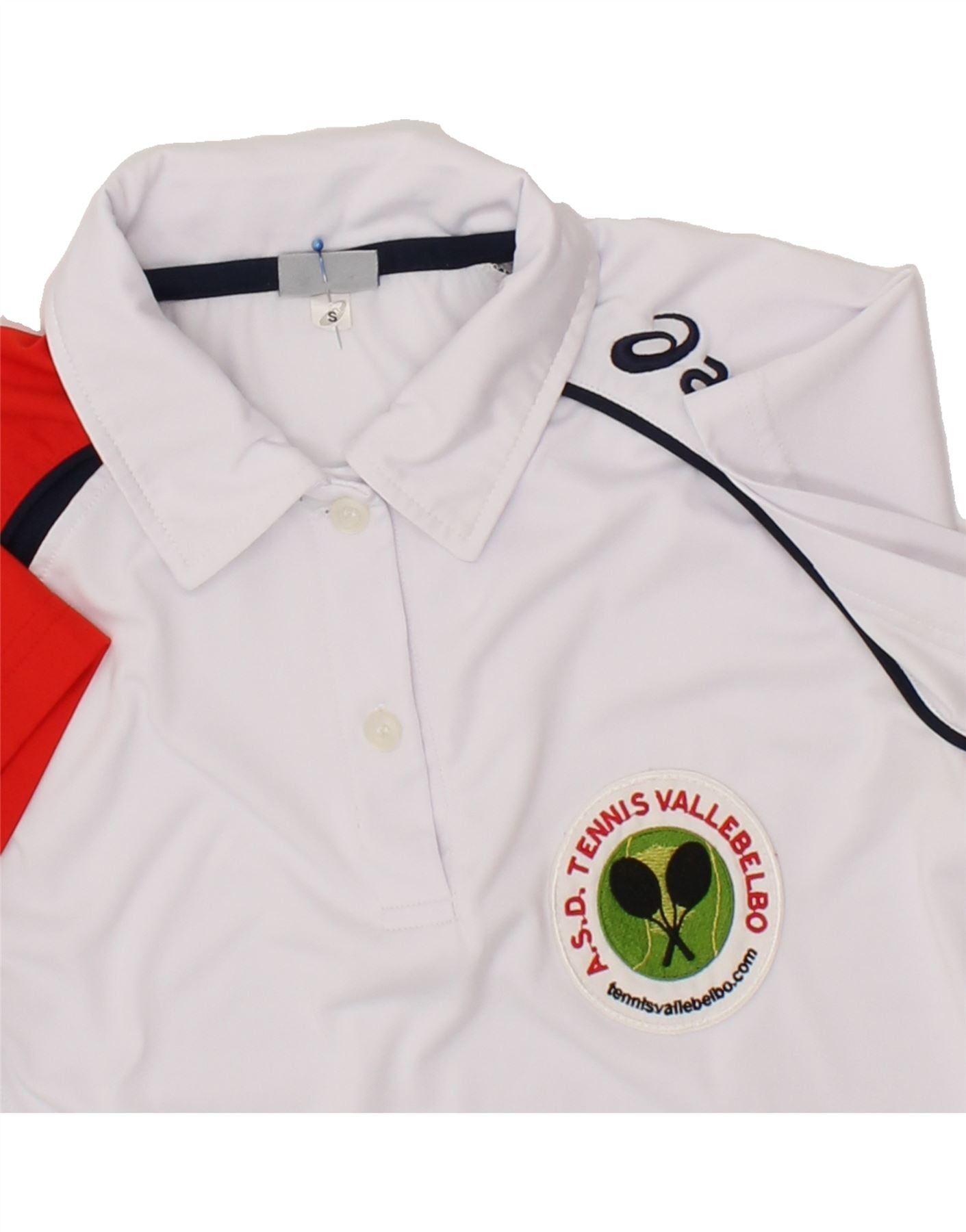 ASICS Womens Graphic Polo Shirt UK 10 Small White Colourblock Polyester Vintage Asics and Second-Hand Asics from Messina Hembry