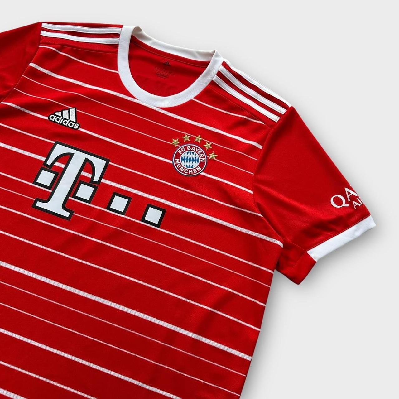 Maillot de football domicile du Bayern Munich de la saison 2022/2023 d'Adidas avec logos brodés et sponsor T-Mobile sur la poitrine. Le nom du joueur « Musiala 42 » est inscrit au dos