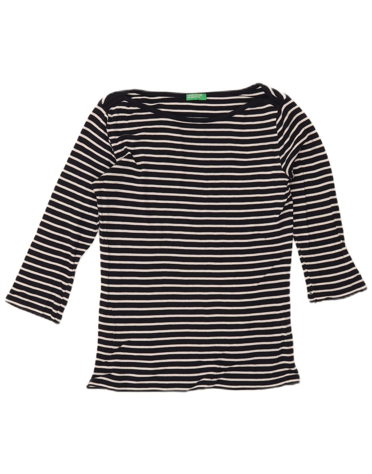 BENETTON Haut Femme Manches 3/4 UK 10 Petit Coton Rayé Bleu Marine