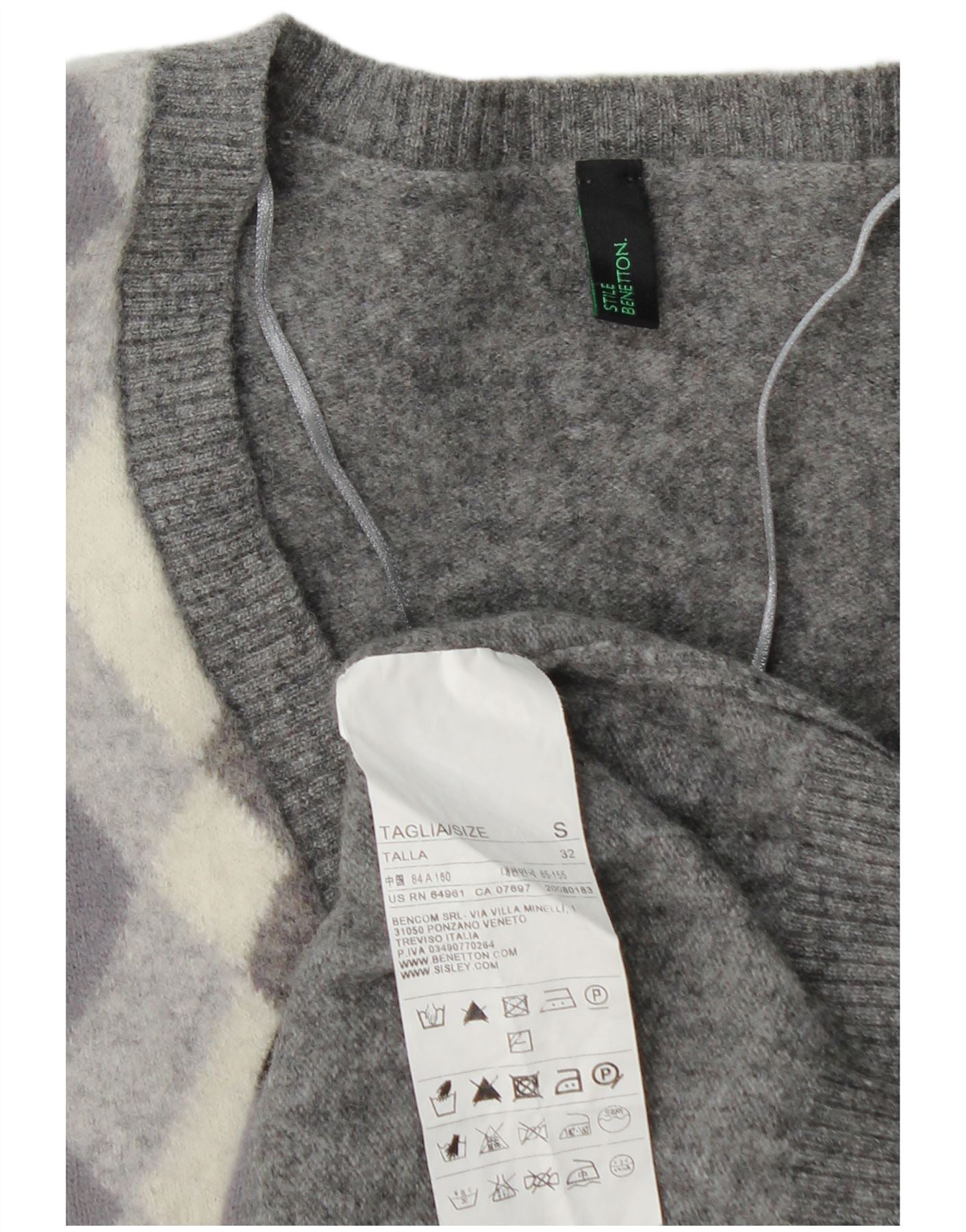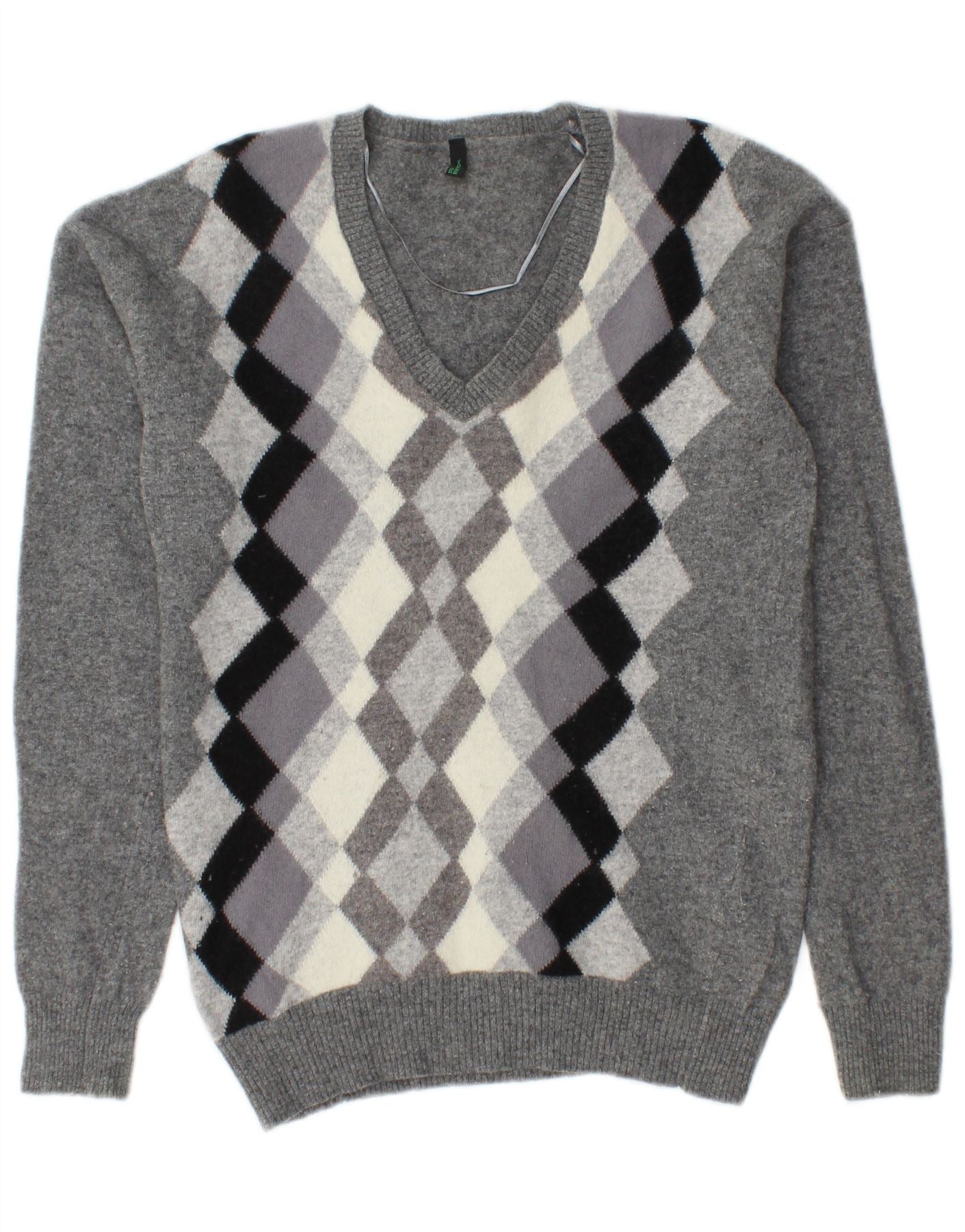 BENETTON Pull col en V pour femme UK 10 Petit gris Argyle/Diamond Laine