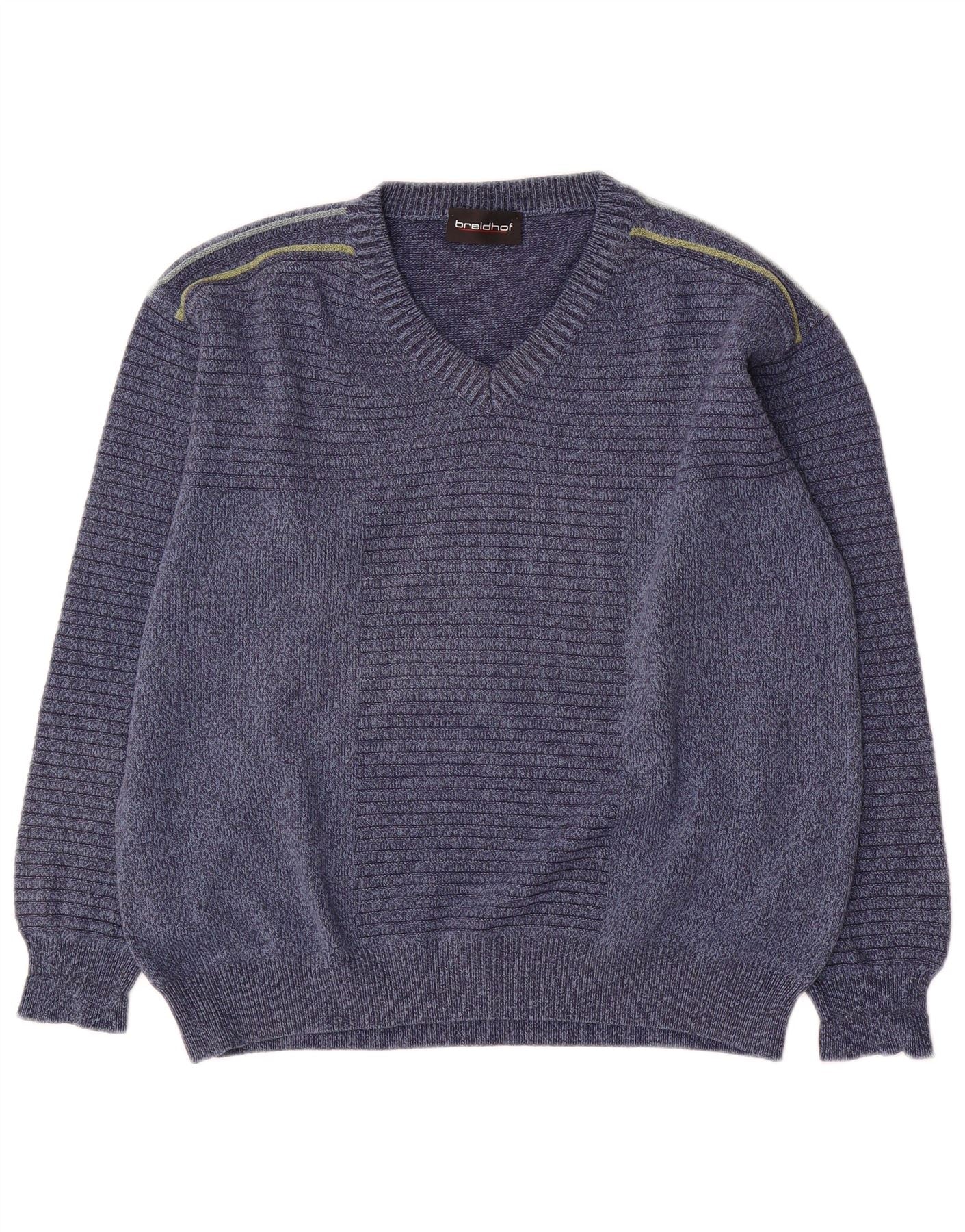 - Description de l'IA : Ce pull à col en V pour homme Breidhof est confectionné à partir d'un mélange de coton polyacrylique doux. Le tissu tricoté bleu présente de subtiles rayures horizontales pour une texture visuelle. Un décolleté en V classique et des manches longues définissent sa structure. La coupe régulière assure un port confortable. Une rayure jaune distinctive orne les épaules, ajoutant une touche moderne. Ce pull offre style et chaleur polyvalents.