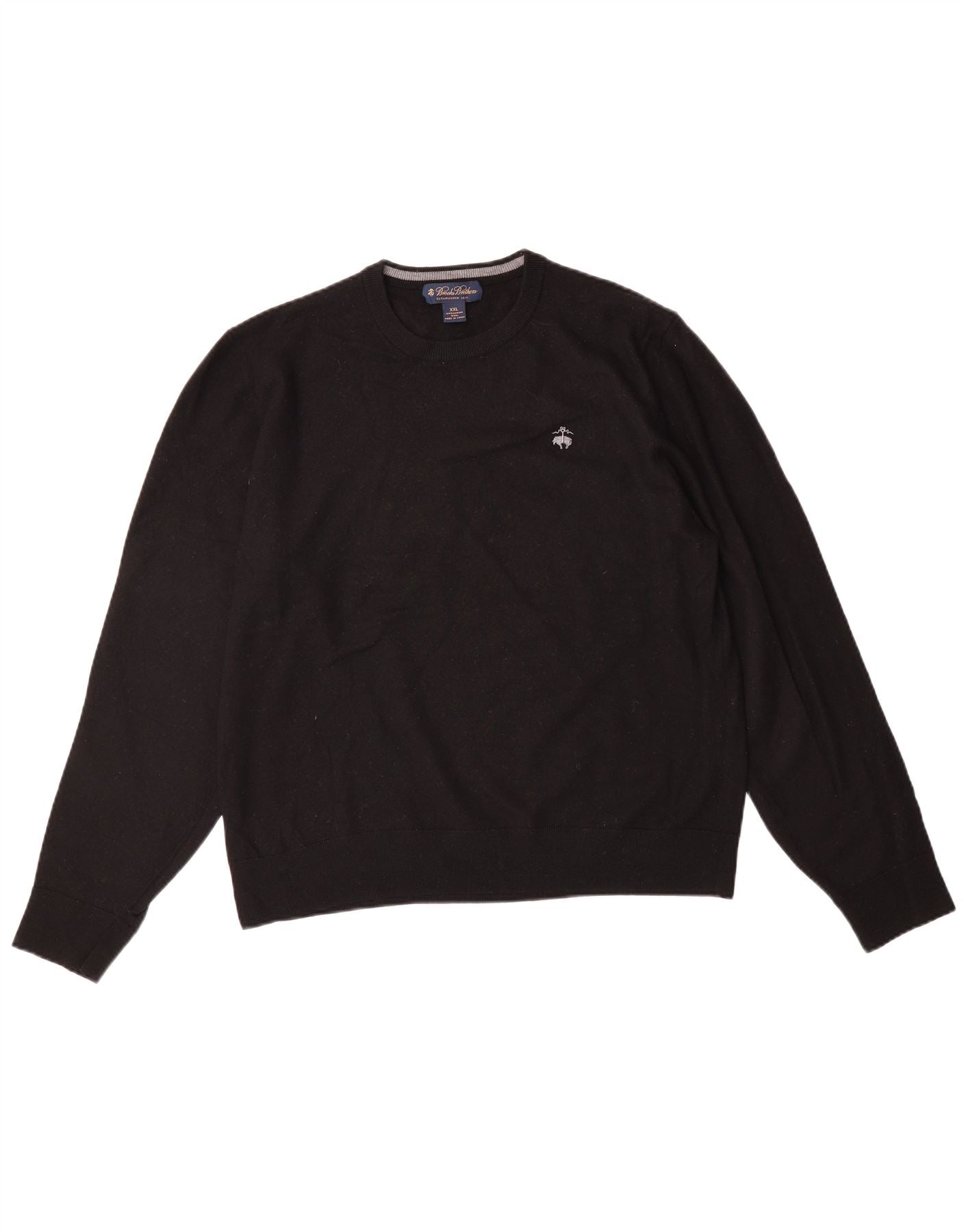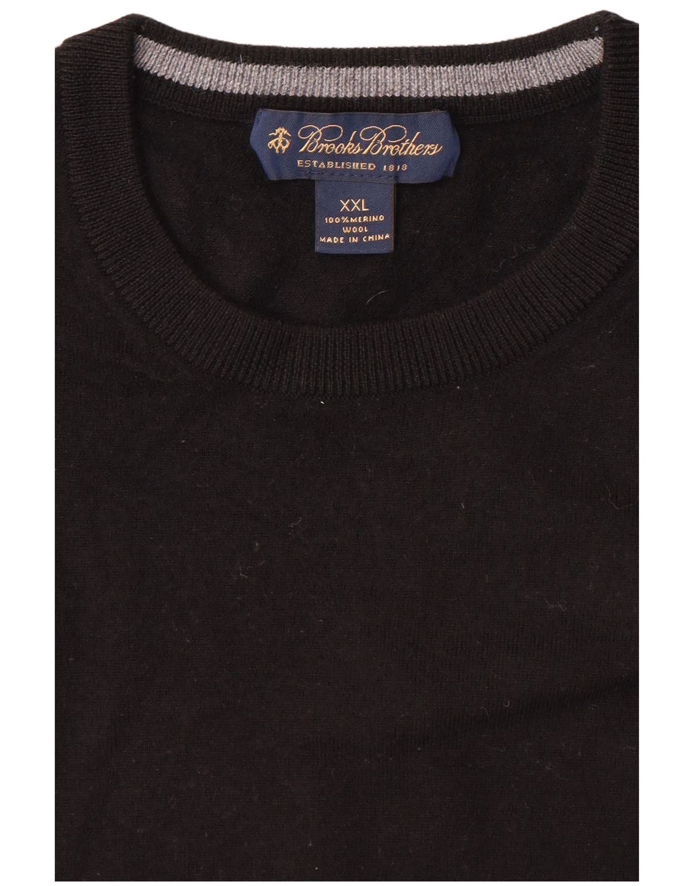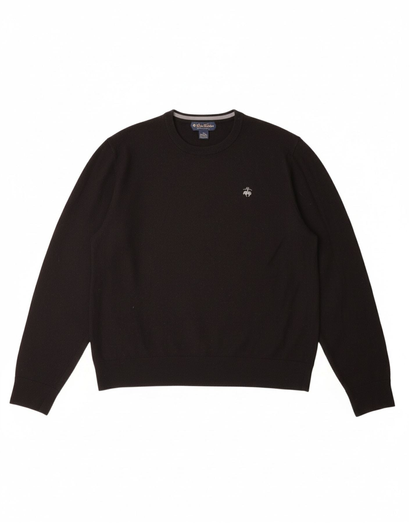- AI Description: This Brooks Brothers mens crew neck jumper is crafted from fine 100 percent Merino wool. Its black knit offers a soft, lightweight, and comfortable feel. The classic round neckline and long sleeves define its traditional pullover structure. A regular fit ensures ease of wear and movement. This style is enhanced by a subtle branded logo detail.