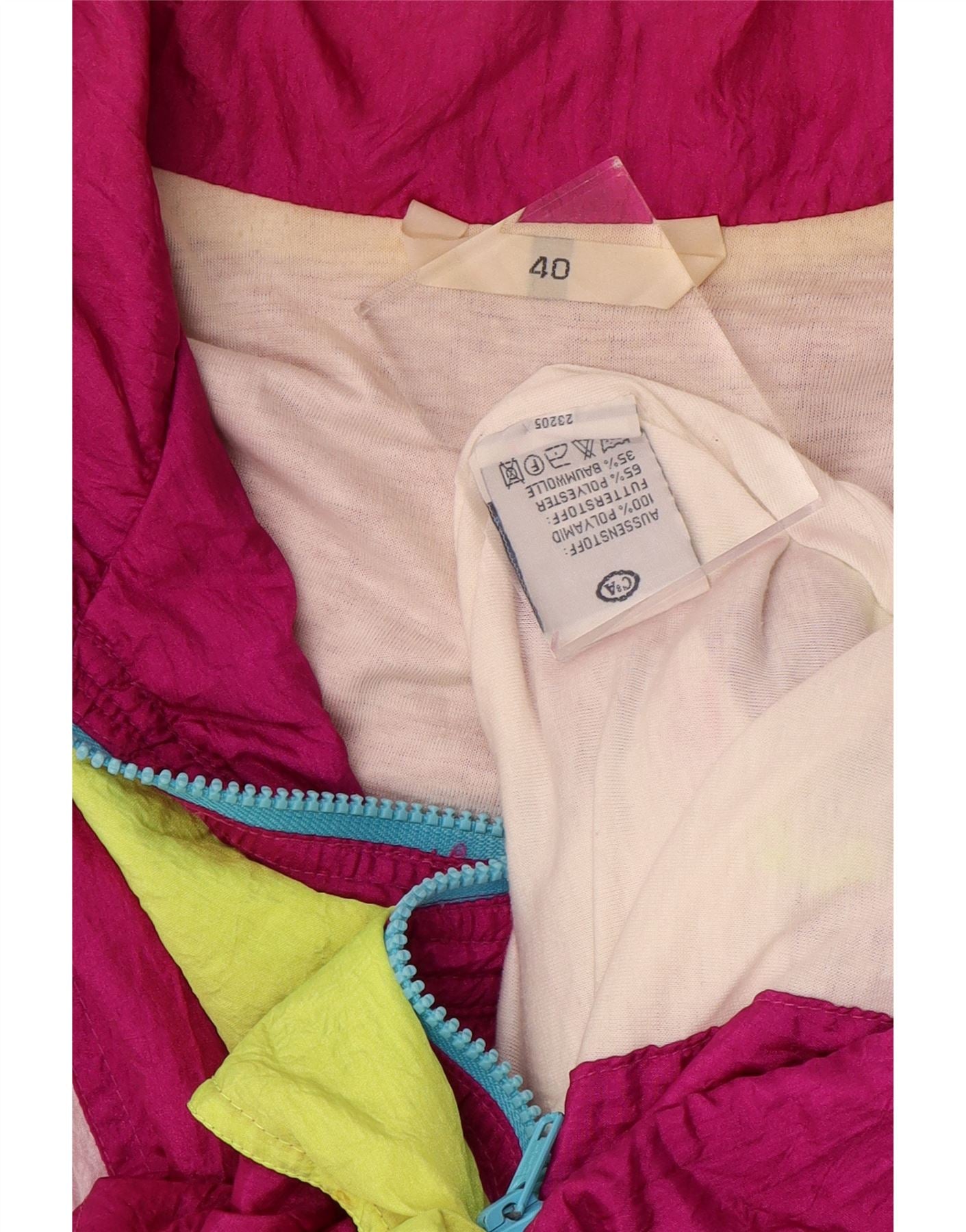 - AI Description: This C & A mens tracksuit top jacket is crafted from lightweight, windproof polyamide, offering a smooth woven texture. It features a collared neckline and long sleeves. The full zip closure ensures practicality. A regular fit provides comfortable wear. The vibrant colourblock pattern gives it a distinct 80s retro style. Practical pockets add functionality.