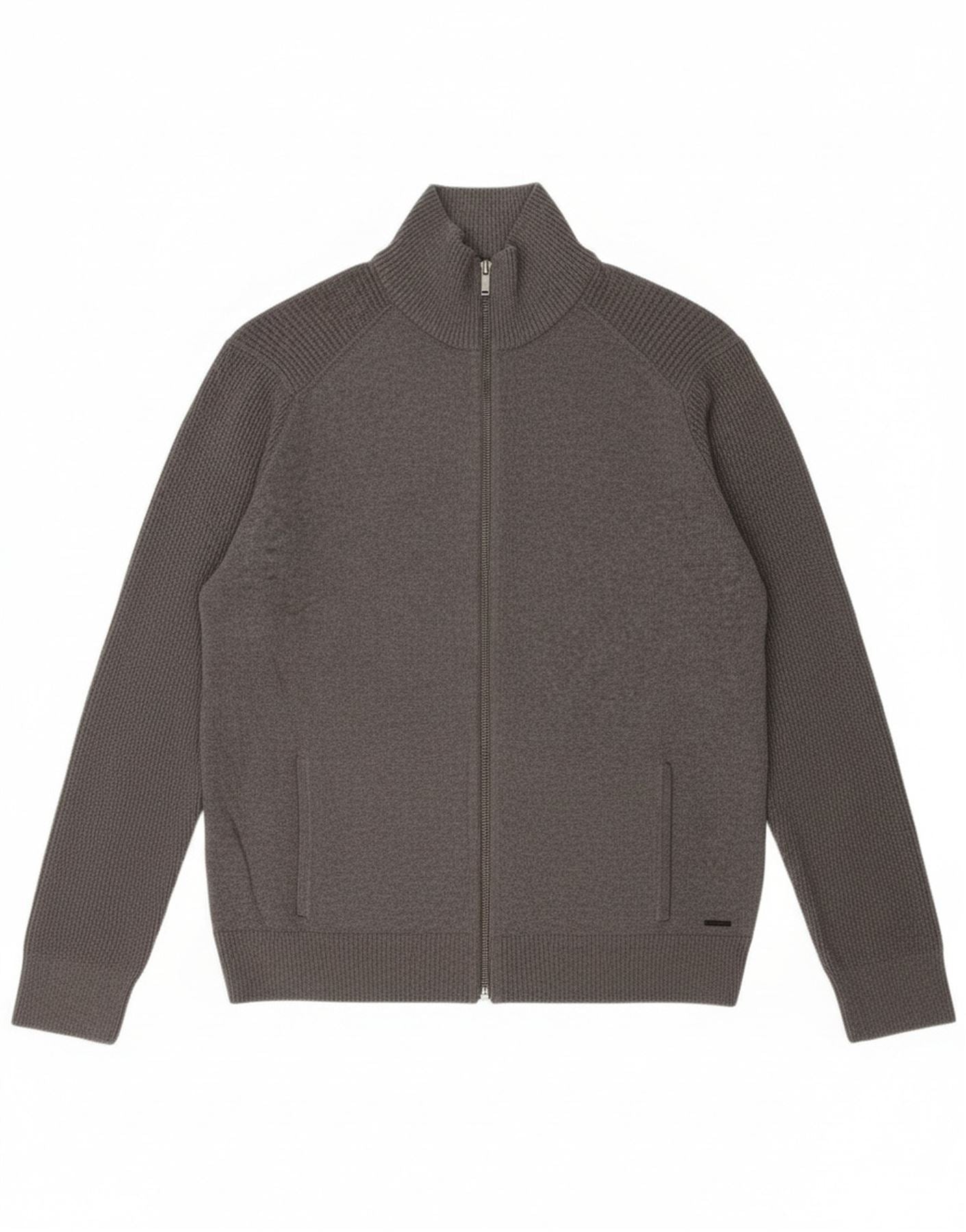 - Description de l'IA : Ce pull cardigan Calvin Klein pour homme est confectionné en tricot gris doux 100 % coton. Il présente un col montant classique et une fermeture zippée complète pour un style polyvalent. Les manches longues et la coupe régulière assurent un port confortable. Le design comprend des poches pratiques, ajoutant à son attrait fonctionnel. Cette pièce classique offre un confort et un style intemporels.