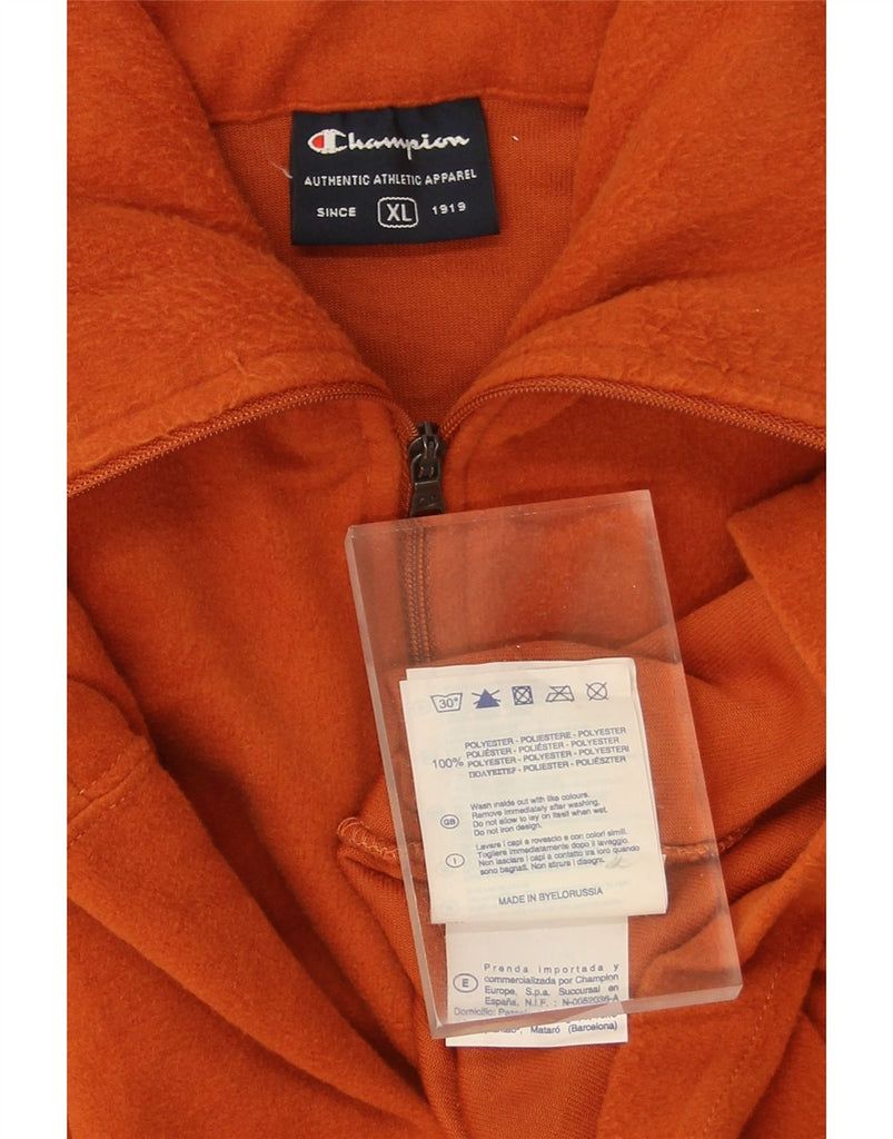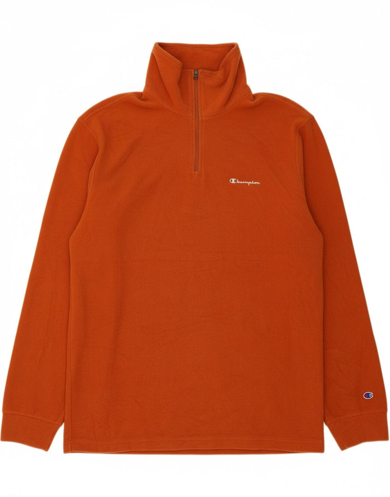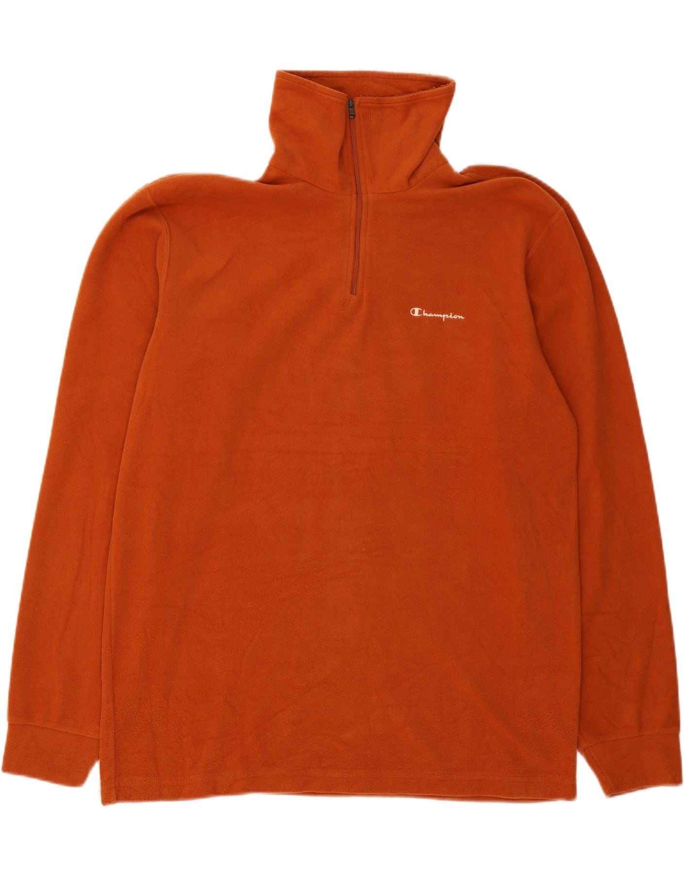 - AI Description: This Champion men's sweatshirt jumper is crafted from a soft, orange 100 percent polyester fleece. The 1/4 zip mock neck design offers adjustable comfort and warmth. Long sleeves complement the regular fit, ensuring ease of movement. A subtle logo detail provides a classic branded accent. This lined jumper combines practicality with a relaxed, versatile style.