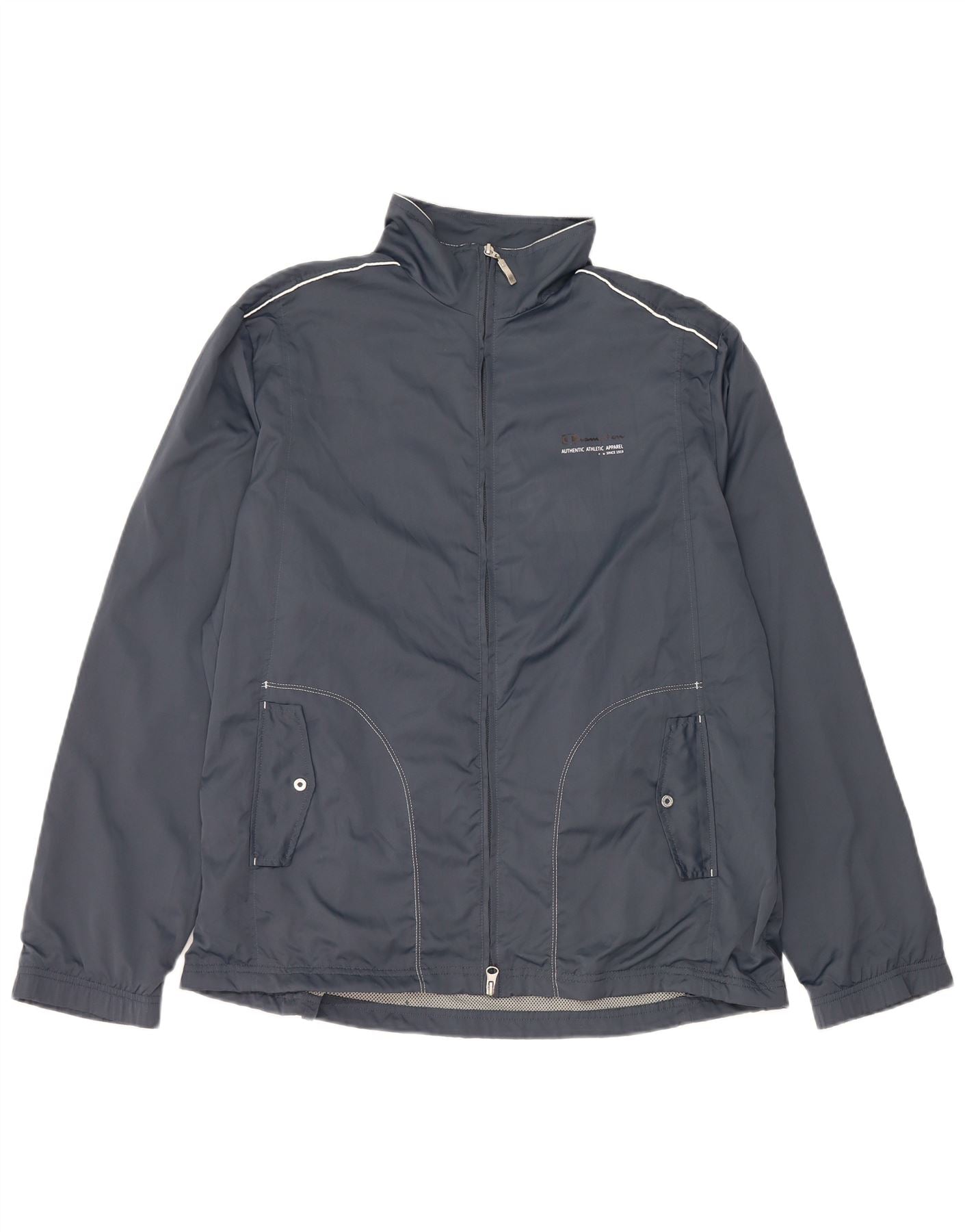 - Description de l'IA : Ce survêtement complet Champion pour femme est confectionné à partir d'un tissu mélangé bleu marine lisse, offrant une coupe régulière confortable. La veste présente un col haut, des manches longues et une fermeture éclair complète. Un passepoil blanc accentue les épaules et les manches. Des poches pratiques sont incluses. Le pantalon a une taille élastiquée et une coupe droite avec un passepoil blanc assorti sur les côtés. Un subtil logo Champion est présent. L'ensemble est doublé pour plus de confort.