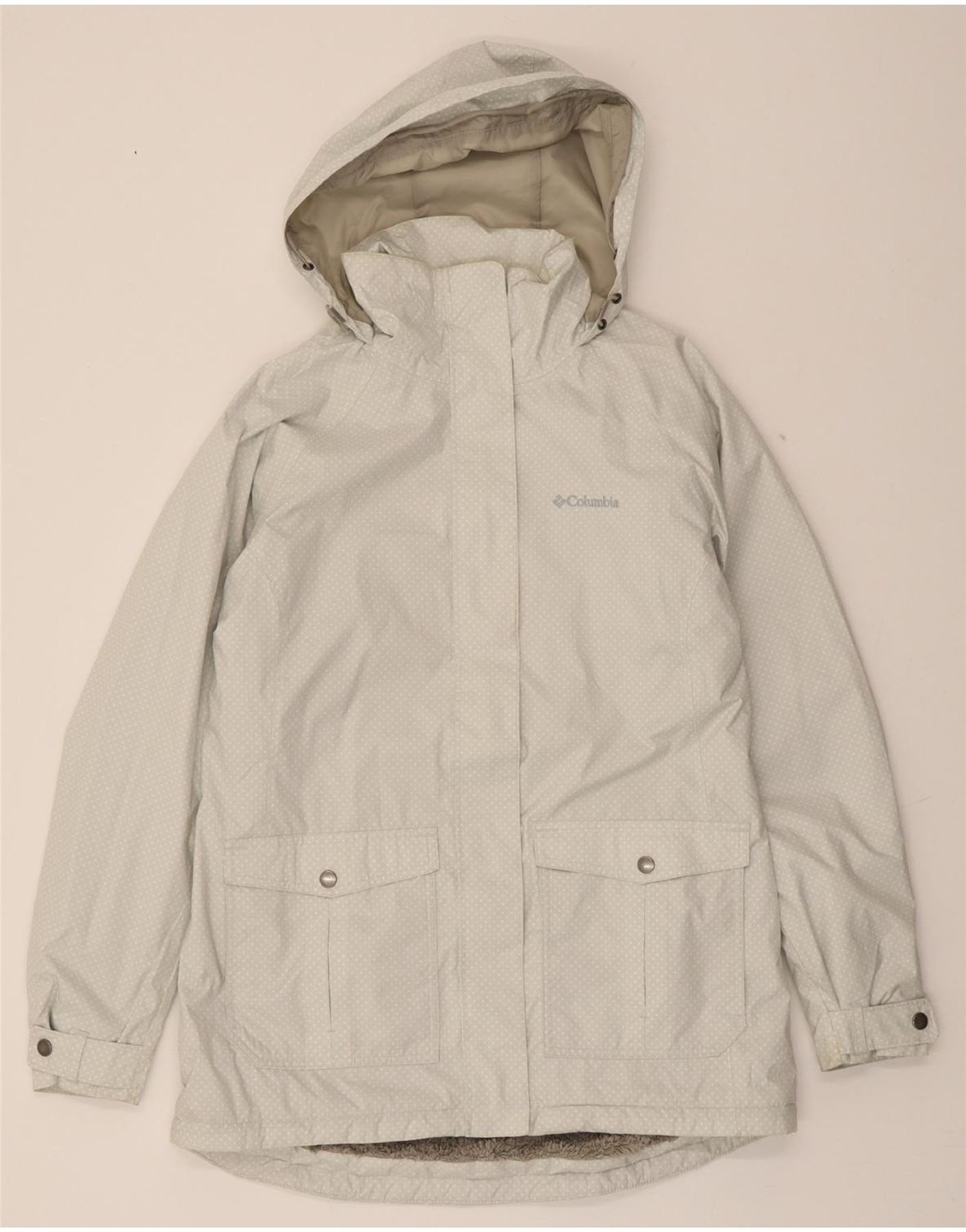 - AI Description: This pre-owned Columbia waterproof jacket is a classic, beige polka dot design in excellent condition. Crafted from 100% polyester with a fleece lining for added warmth. Features include a removable hood, long sleeves, a collared neckline, and multiple pockets. The regular fit ensures comfort, while snap closures offer practicality. Accented with buttons and subtle logo detailing. Label size M. Perfect for outdoor adventures.