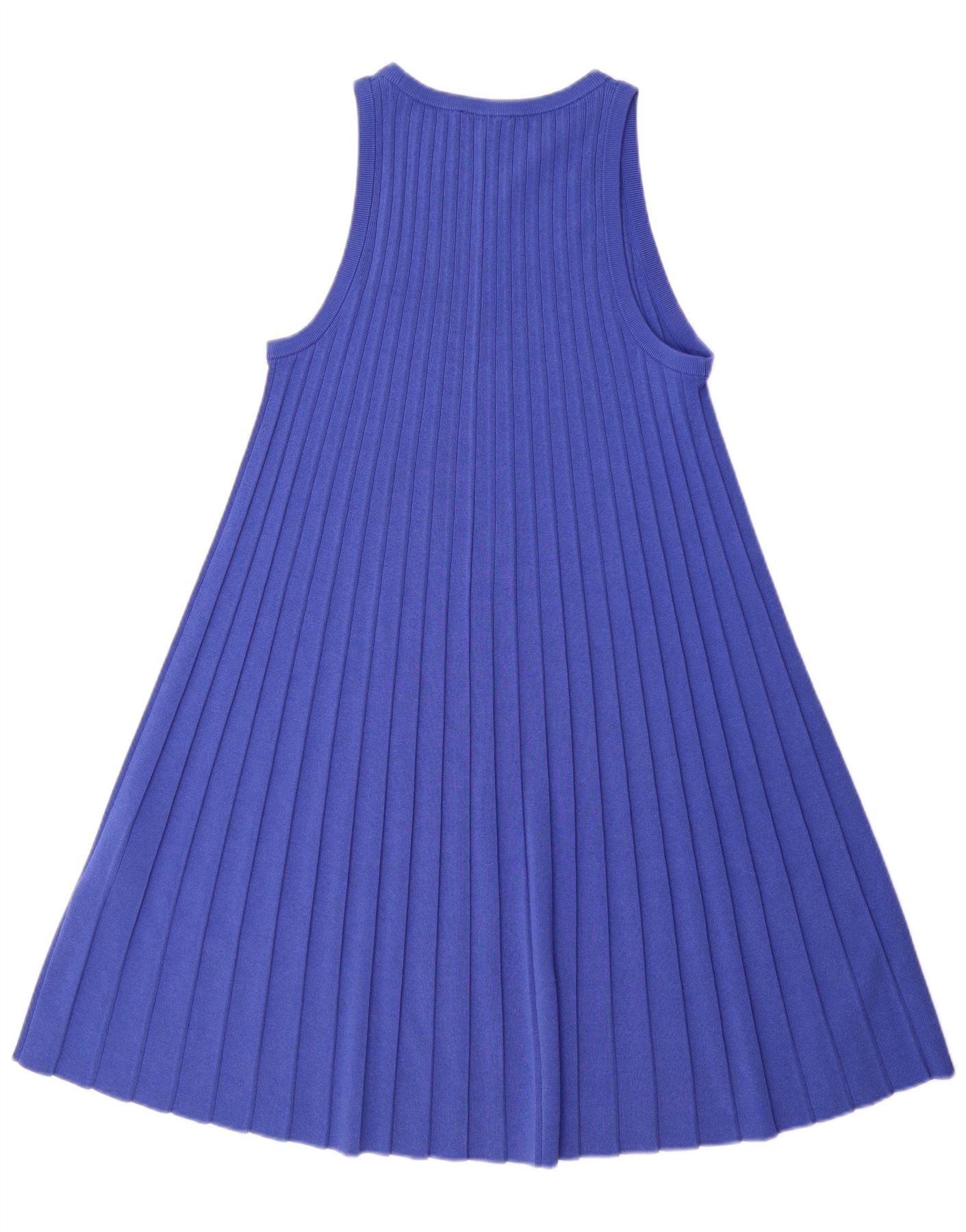 - Description de l'IA : Cette robe trapèze Cos pour femme est confectionnée à partir d'un tissu tricoté bleu vif avec une texture côtelée distincte. Il présente une encolure ronde classique et un design sans manches. La coupe décontractée se transforme en une silhouette trapèze gracieuse. Les nervures verticales ajoutent un intérêt visuel et une structure au design moderne. Il s’agit d’un style de pull simple, offrant une élégance sans effort.