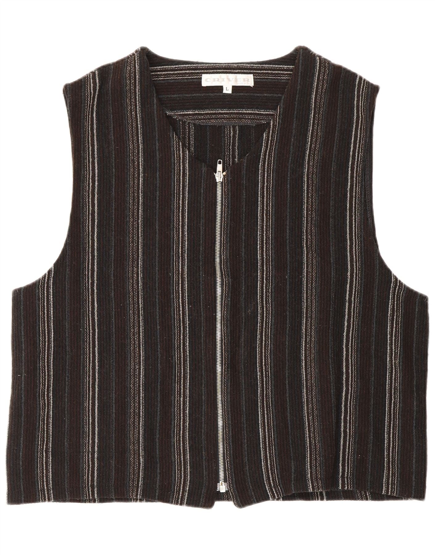 - Description de l'IA : Ce gilet Criver pour homme est confectionné à partir d'un riche mélange multicolore de polyester, de laine d'agneau et de laine. Il présente un motif rayé distinctif dans des tons noirs, marron et gris. Le design sans manches et l'encolure ronde offrent une silhouette classique. Une fermeture éclair complète apporte une touche moderne et facile à porter. Sa coupe régulière assure une superposition confortable et une apparence élégante.