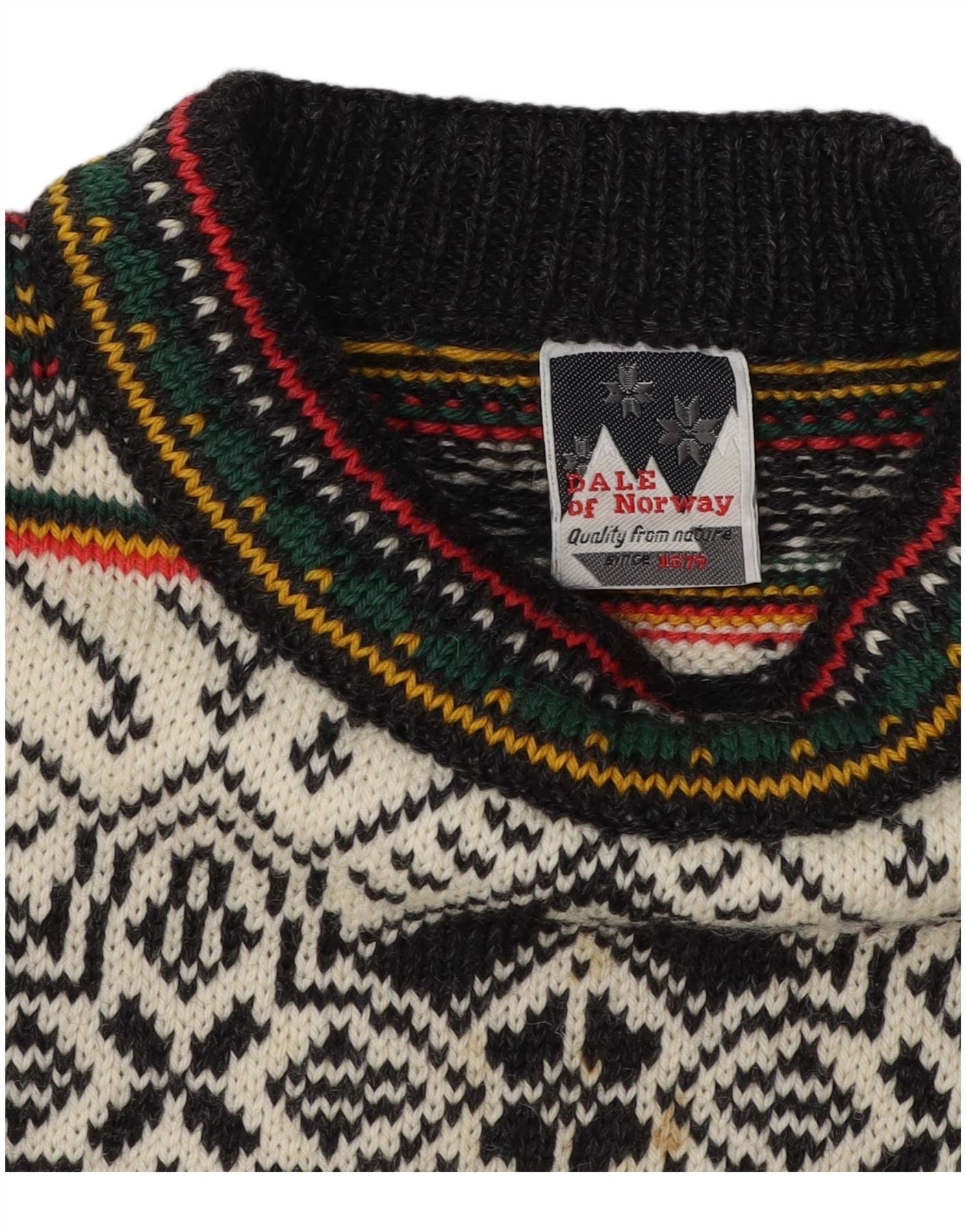 - AI Description: This Dale Of Norway mens crew neck jumper is crafted from a black knit fabric. It features a distinctive Fair Isle abstract pattern across the chest and shoulders. The classic round neck and long sleeves offer a timeless silhouette. Its pullover design ensures a regular fit for comfortable wear. This piece combines traditional craftsmanship with a refined aesthetic.