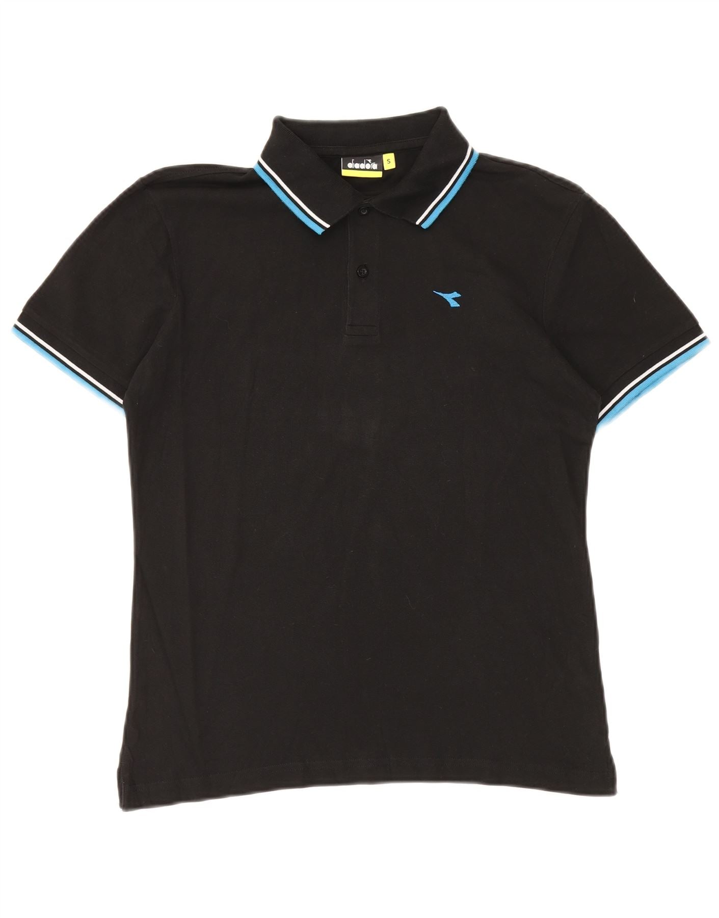 - Description de l'IA : Ce polo Diadora pour homme est confectionné en jersey 100 % coton noir doux. Il présente une encolure classique avec une patte à trois boutons. Les manches courtes sont finies avec des poignets côtelés. Le col et les poignets affichent tous deux des rayures bleues et blanches distinctives. Un subtil logo brodé orne la poitrine. Ce polo de coupe régulière offre confort et un style décontracté et élégant.