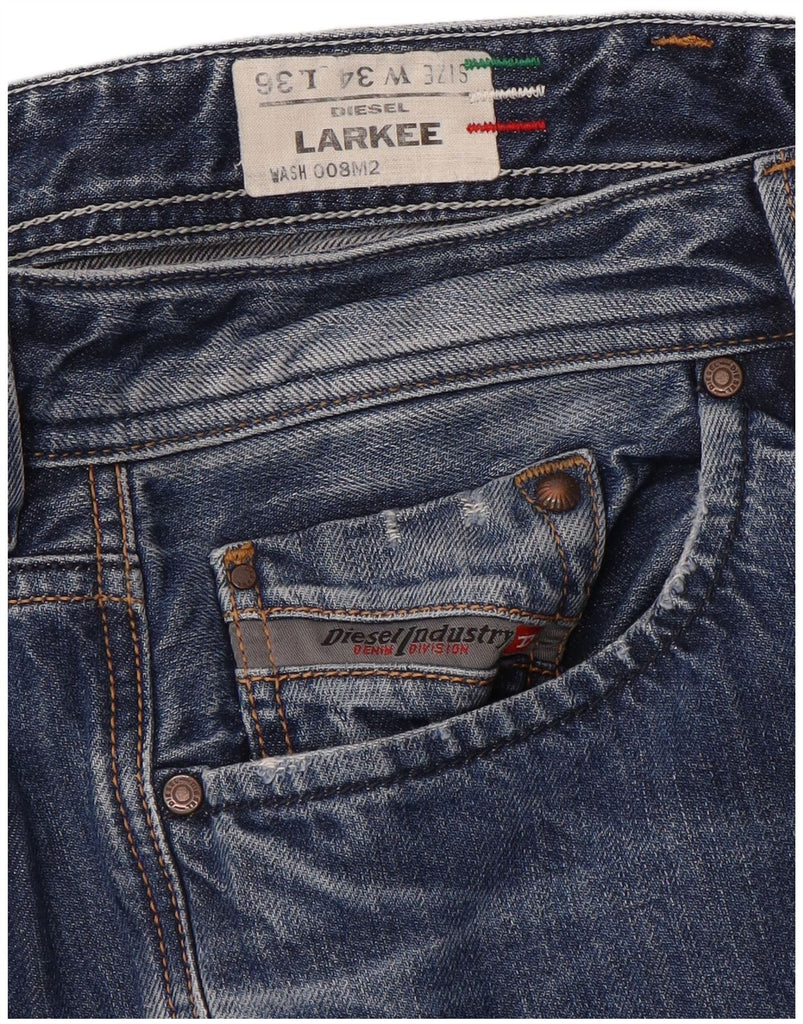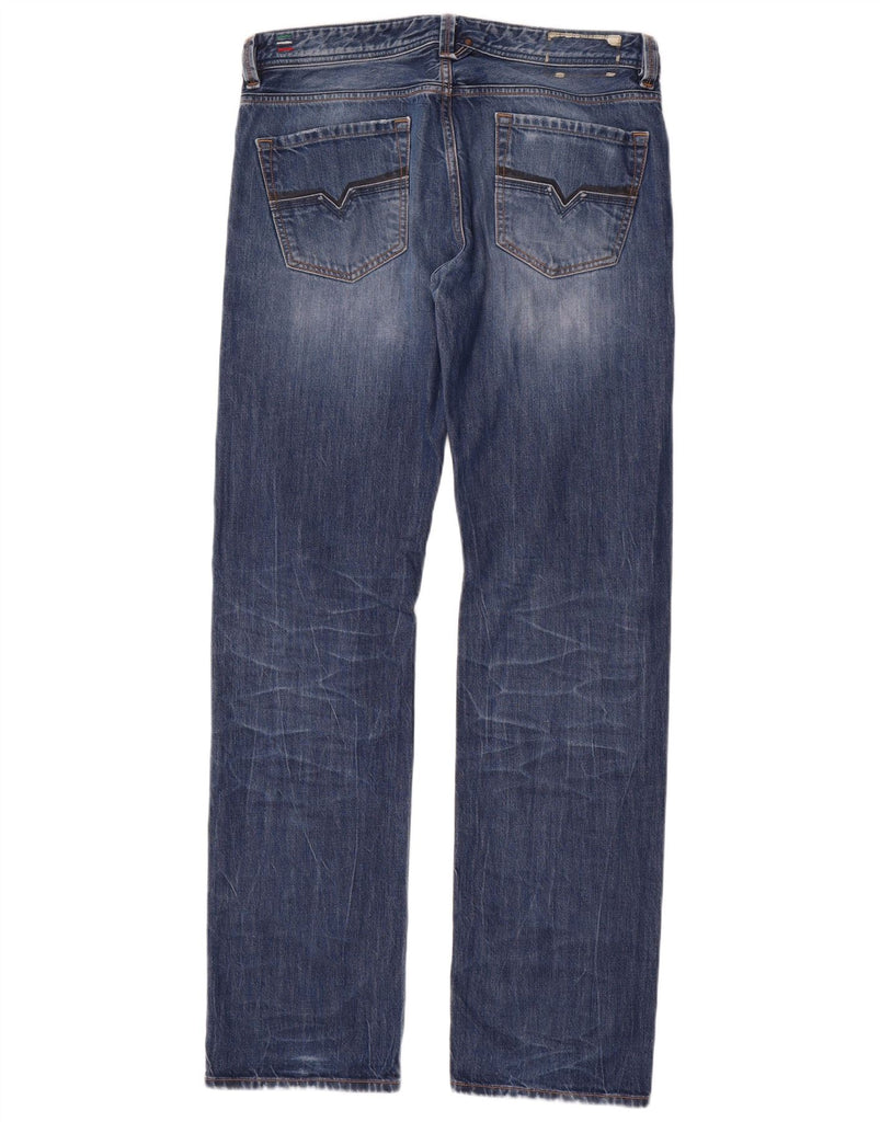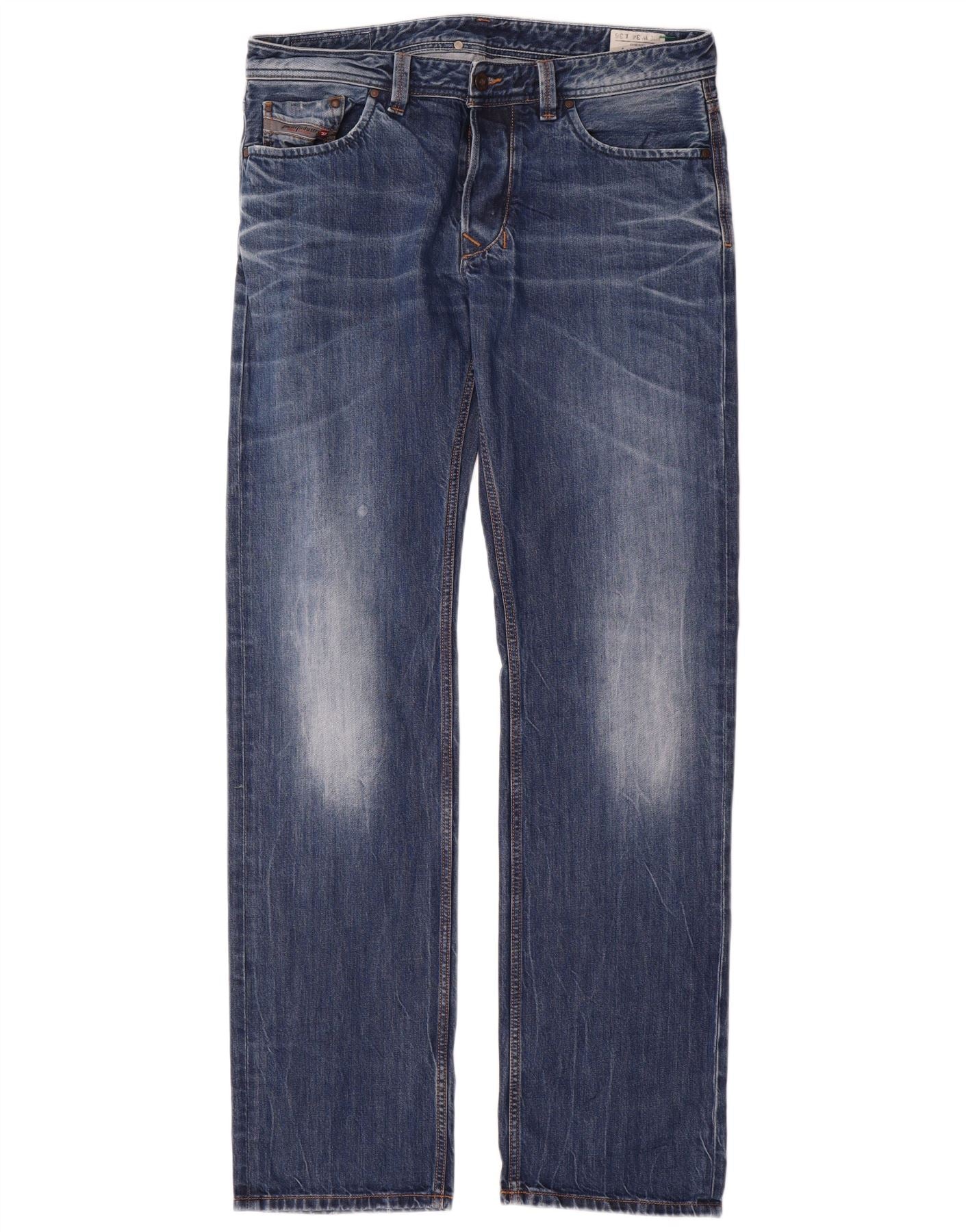- AI Description: These Diesel mens straight jeans are crafted from robust blue denim. They feature a regular fit for comfortable wear. The straight leg design offers a classic silhouette. A button closure secures the waist. Subtle distressed detailing adds a contemporary edge. Practical pockets provide functionality. A discreet brand logo completes the design.
