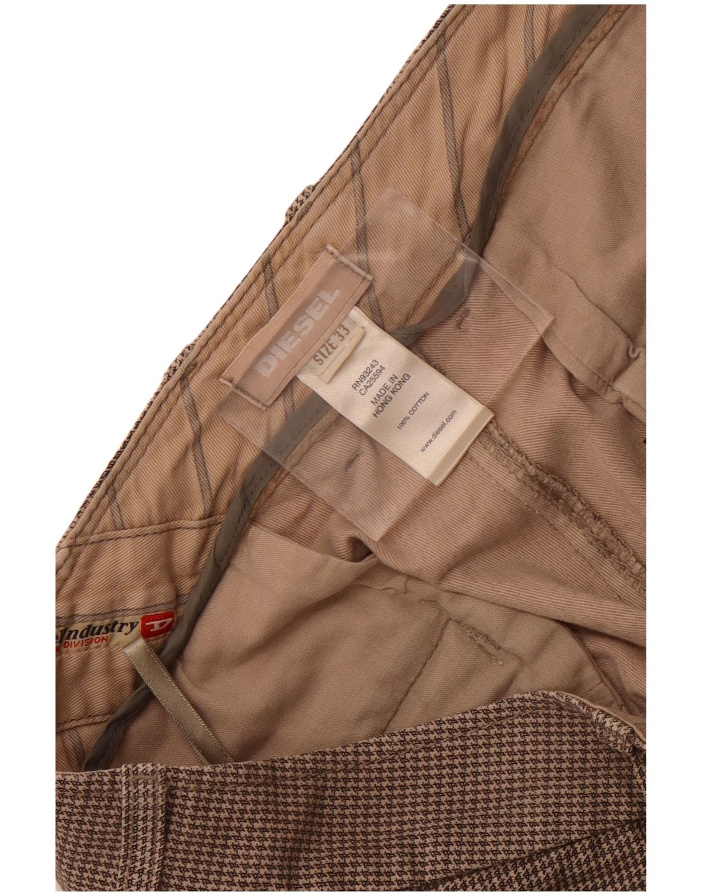 - Description de l'IA : Ce pantalon décontracté Diesel pour hommes est confectionné à 100 % en coton tissé. Ils présentent un motif pied-de-poule marron classique, offrant une texture sophistiquée. La coupe régulière assure un port confortable, tandis que la fermeture à bouton offre une fermeture sécurisée. Des poches pratiques sont incluses pour plus de commodité. Ce style intemporel offre un look à la fois élégant et décontracté, parfait pour l'élégance au quotidien.