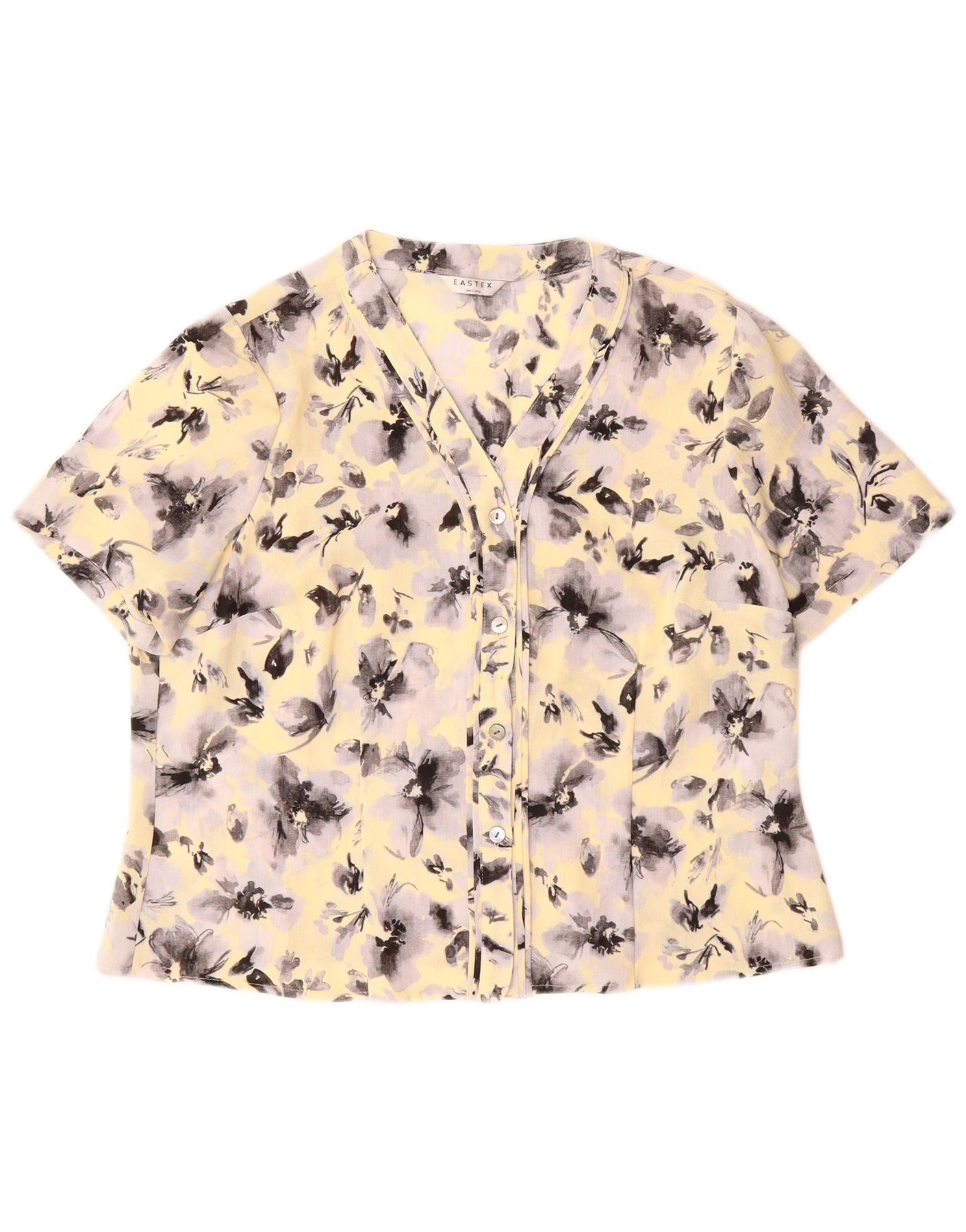 - AI Description: This Eastex womens shirt blouse is crafted from lightweight woven polyester. It features a vibrant yellow multicoloured floral abstract pattern. The V-neckline and short sleeves offer a classic, comfortable silhouette. A button-up front secures the regular fit, ensuring timeless style. This piece combines elegance with a fresh, bright aesthetic.
