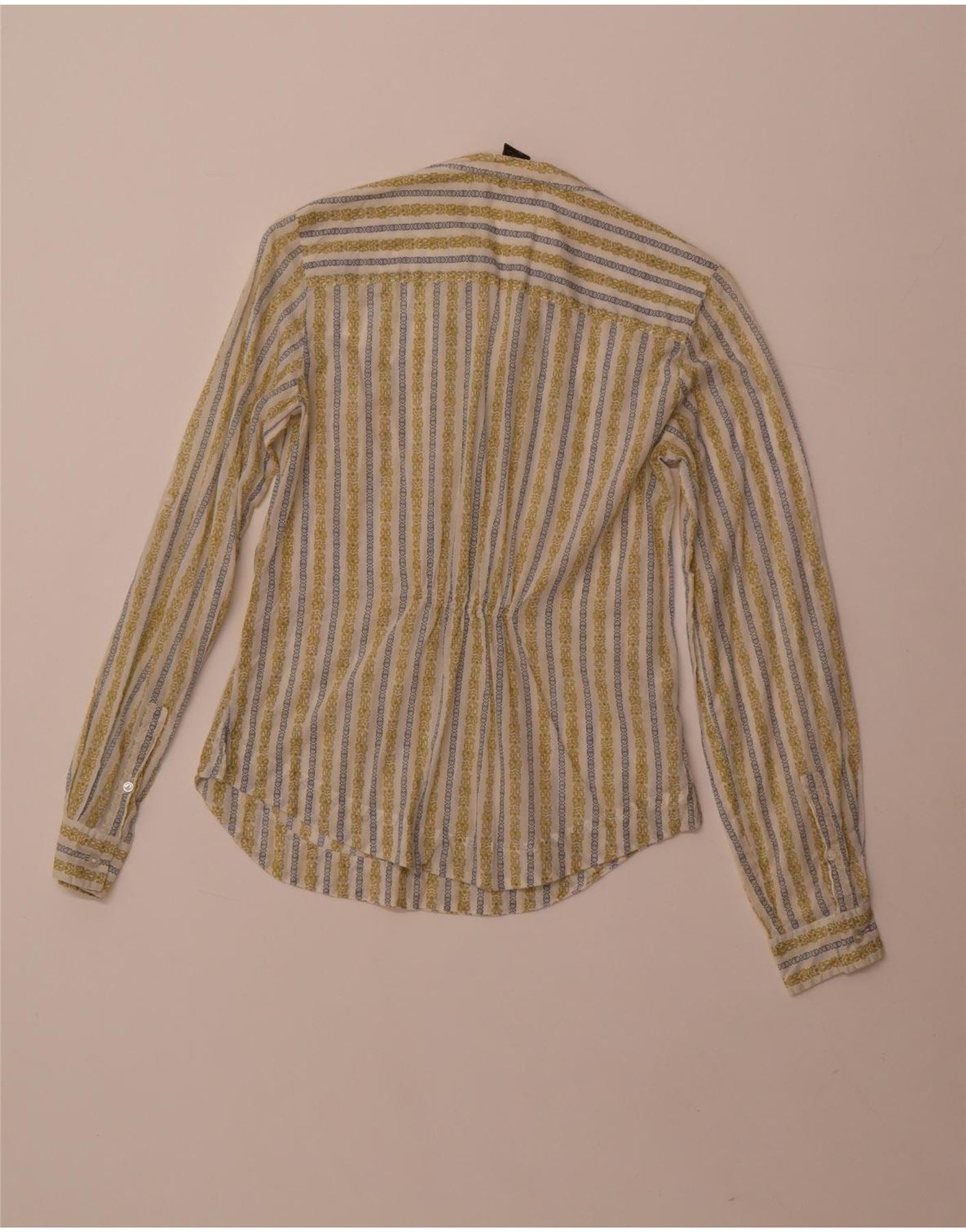 - Description de l'IA : Ce chemisier chemise Eddie Bauer pour femme est fabriqué à partir de tissu tissé 100 % coton, offrant une sensation de légèreté. Il présente un motif rayé multicolore, combinant des tons blanc cassé, jaune et bleu. L'encolure à col mène à une fermeture boutonnée sur le devant. Manches longues terminées par poignets boutonnés. Sa coupe régulière assure un port confortable. Le motif rayé abstrait ajoute un intérêt visuel.