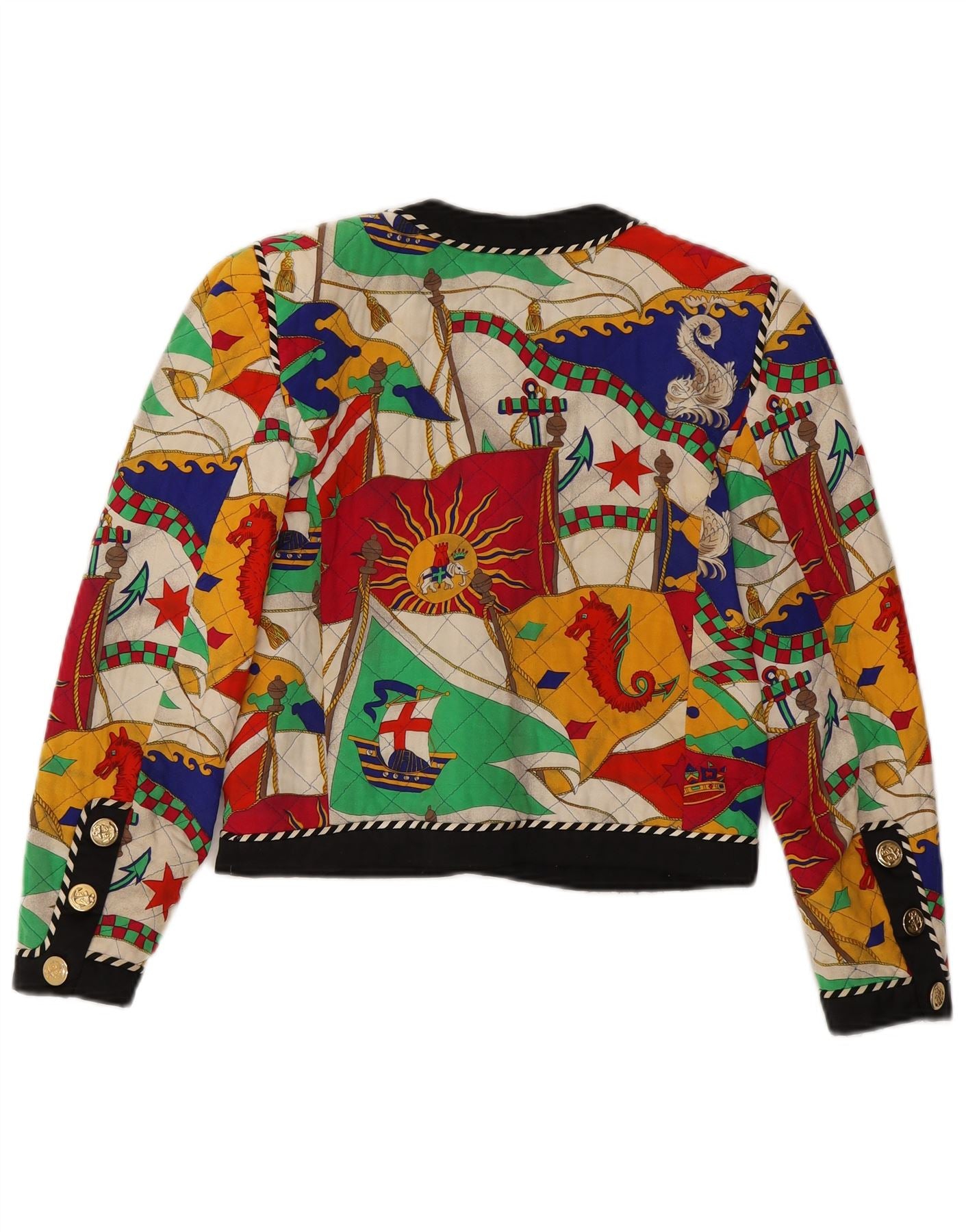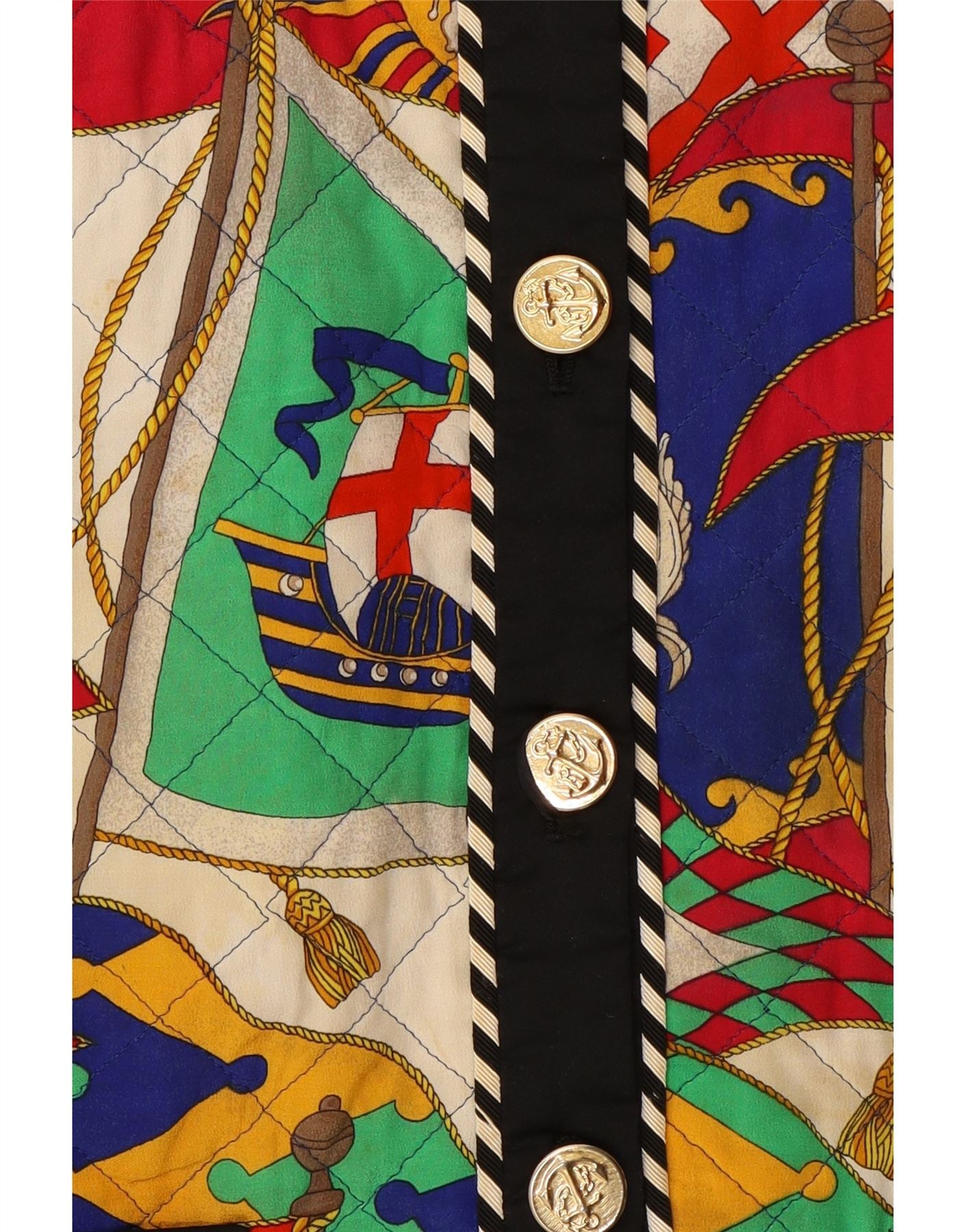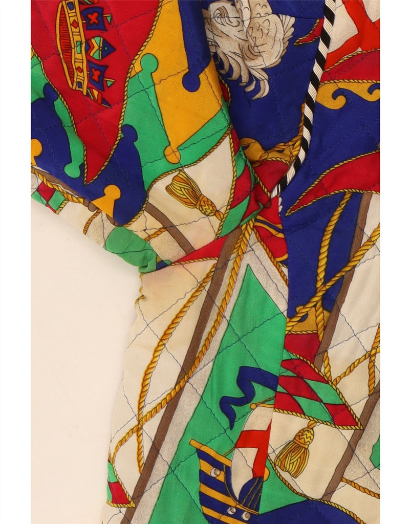 - AI Description: This Escada womens quilted jacket features a vibrant multicoloured woven fabric with a quilted finish. The abstract pattern creates a striking visual. Tonal buttons secure the front closure. It has a classic round neck and long sleeves. The regular fit offers comfortable wear. Fully lined for added comfort and warmth, it embodies a nautical style, perfect for a sophisticated look.