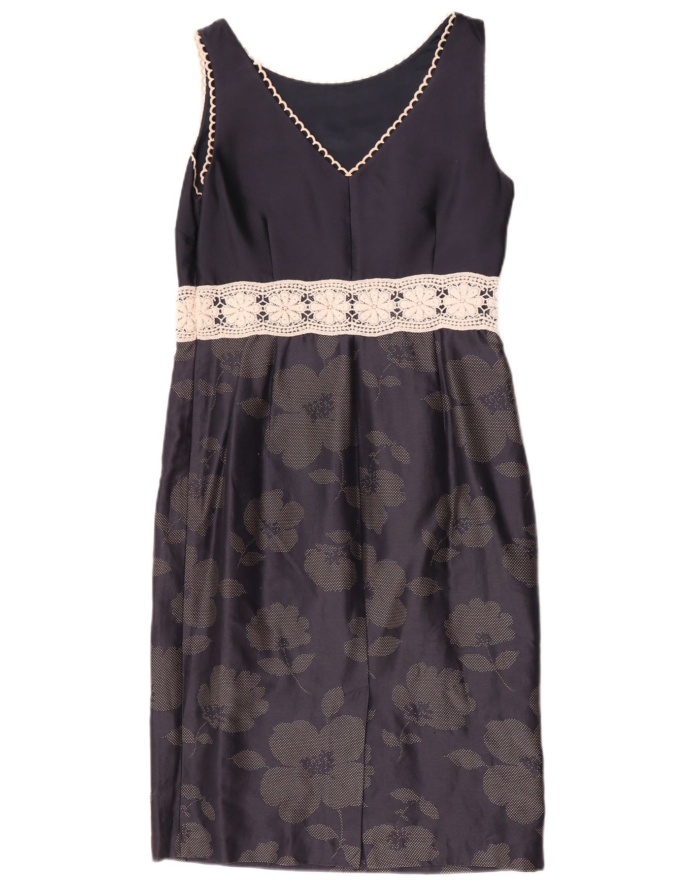 - Description de l'IA : Cette robe fourreau pour femme Fenn Wright Manson est confectionnée à partir d'un luxueux tissu en coton mélangé bleu marine avec un éclat subtil. Il présente une encolure en V classique et un design sans manches. Une délicate bordure en dentelle accentue le décolleté et définit la taille. La section jupe présente un motif floral ton sur ton, tissé dans le tissu pour une élégance discrète. La coupe classique et la fermeture zippée assurent une silhouette élégante.