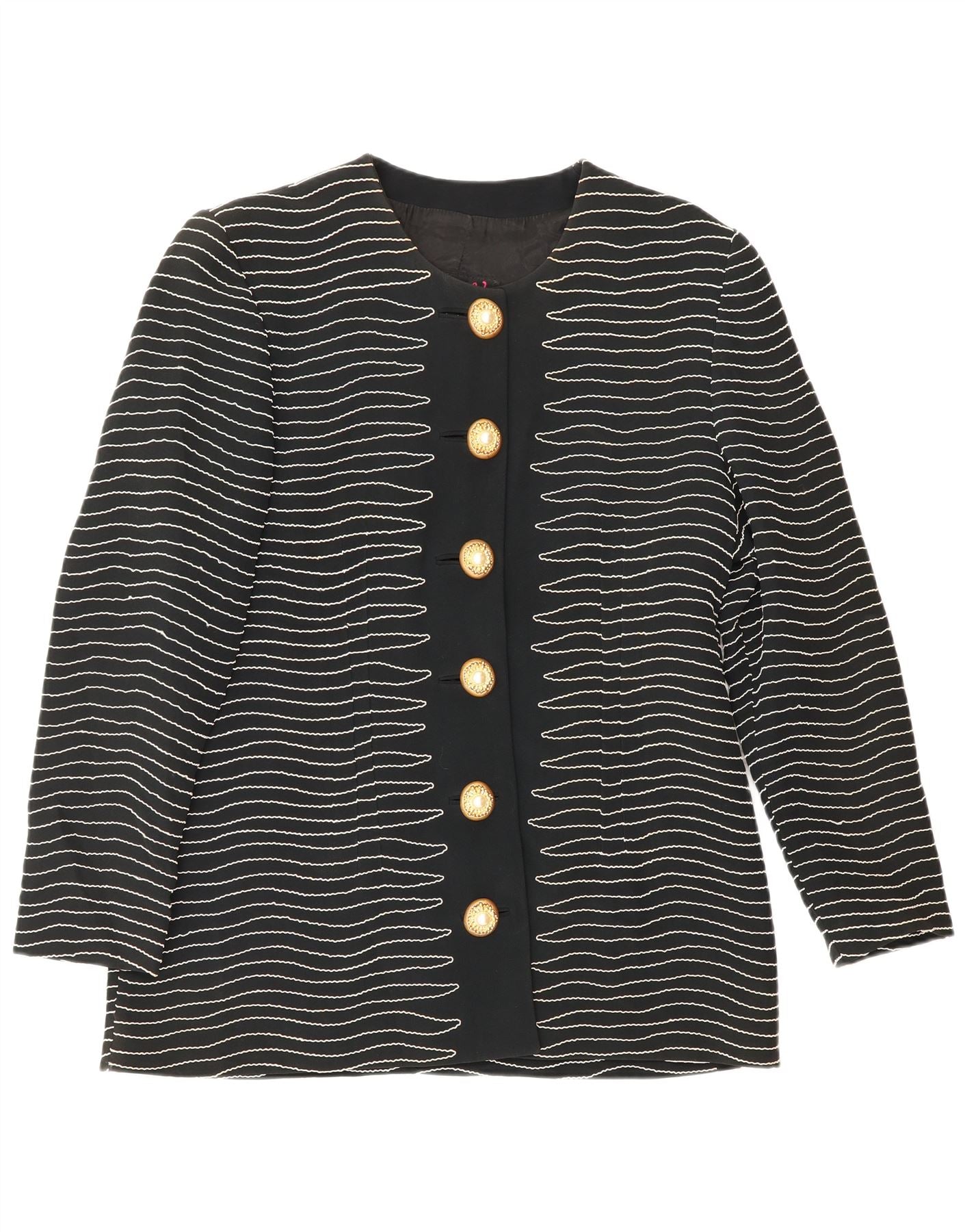 - Description de l'IA : Cette veste blazer pour femme Gai Mattiolo est confectionnée à partir d'un tissu tissé noir. Il présente un motif géométrique distinctif de lignes ondulées sur le corps et des manches longues. Le design classique à col rond offre une silhouette sophistiquée. Sept boutons en perles ornés assurent une fermeture remarquable sur le devant. Cette veste de coupe régulière combine une coupe structurée avec des détails visuels uniques, parfaits pour un ensemble élégant.