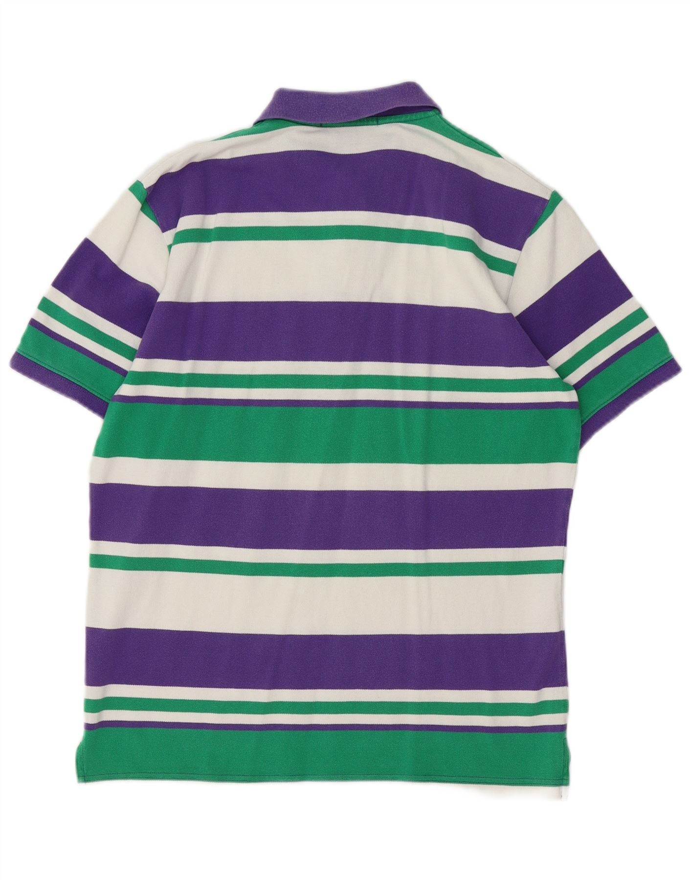 - Description de l'IA : Ce polo Gant pour homme est confectionné dans un tissu en jersey doux, offrant une sensation de confort. Il présente une encolure à col classique avec une fermeture boutonnée soignée. Le design présente un motif rayé audacieux en blanc, violet et vert. Les manches courtes et la coupe régulière assurent une silhouette intemporelle et décontractée. Un subtil logo brodé ajoute une touche signature à ce style classique.