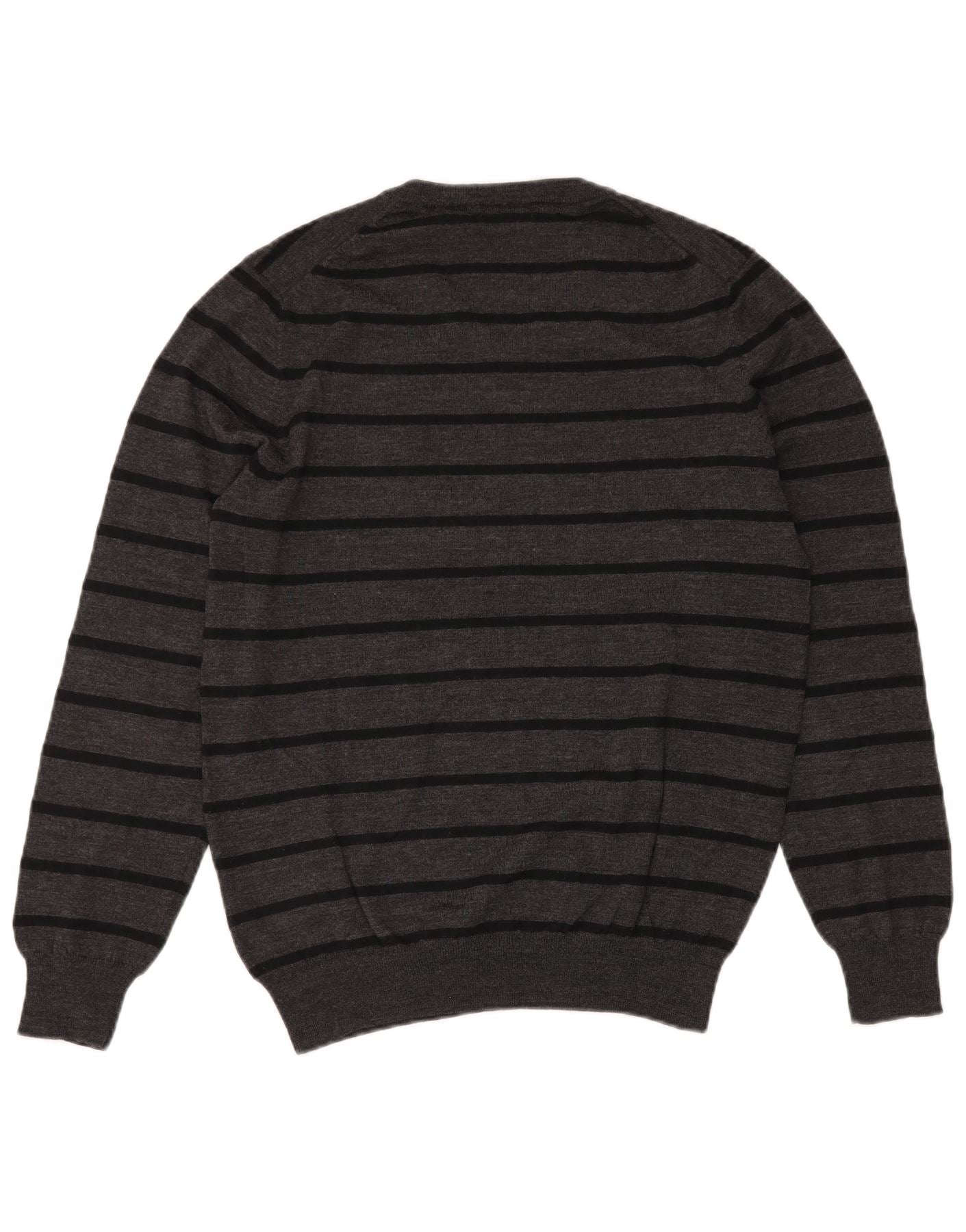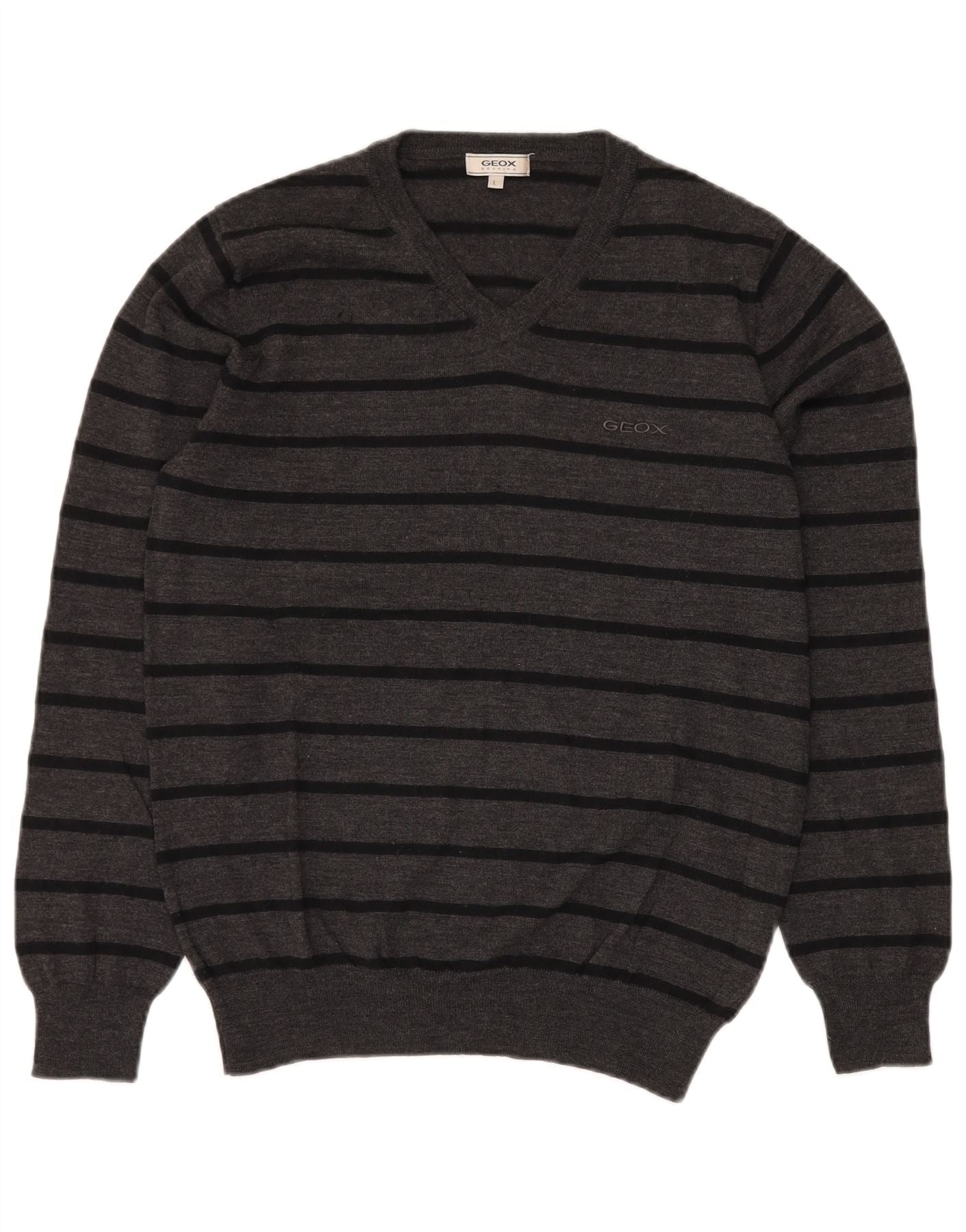 GEOX Pull col en V pour femme UK 16 Grande laine mérinos rayée grise