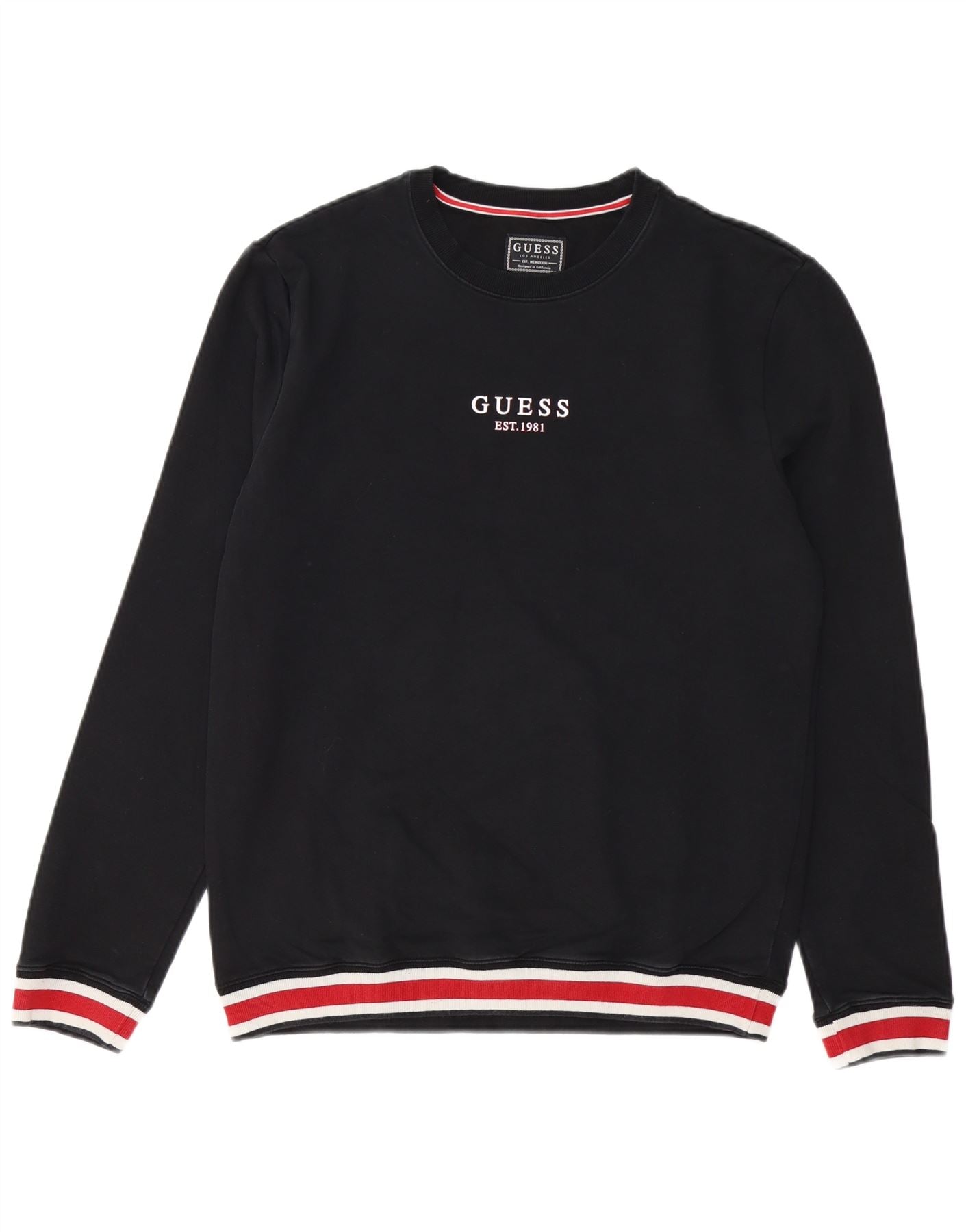 - Description de l'IA : Ce pull sweat-shirt Guess pour homme est confectionné à partir d'un tricot confortable en coton mélangé noir. Il présente un col rond classique et des manches longues. La coupe slim offre une silhouette moderne. Un logo GUESS EST 1981 bien visible orne la poitrine. Les poignets et l'ourlet côtelés sont ornés de rayures rouges et blanches frappantes. Ce modèle de pull offre à la fois style et confort, avec une élasticité supplémentaire pour faciliter les mouvements.