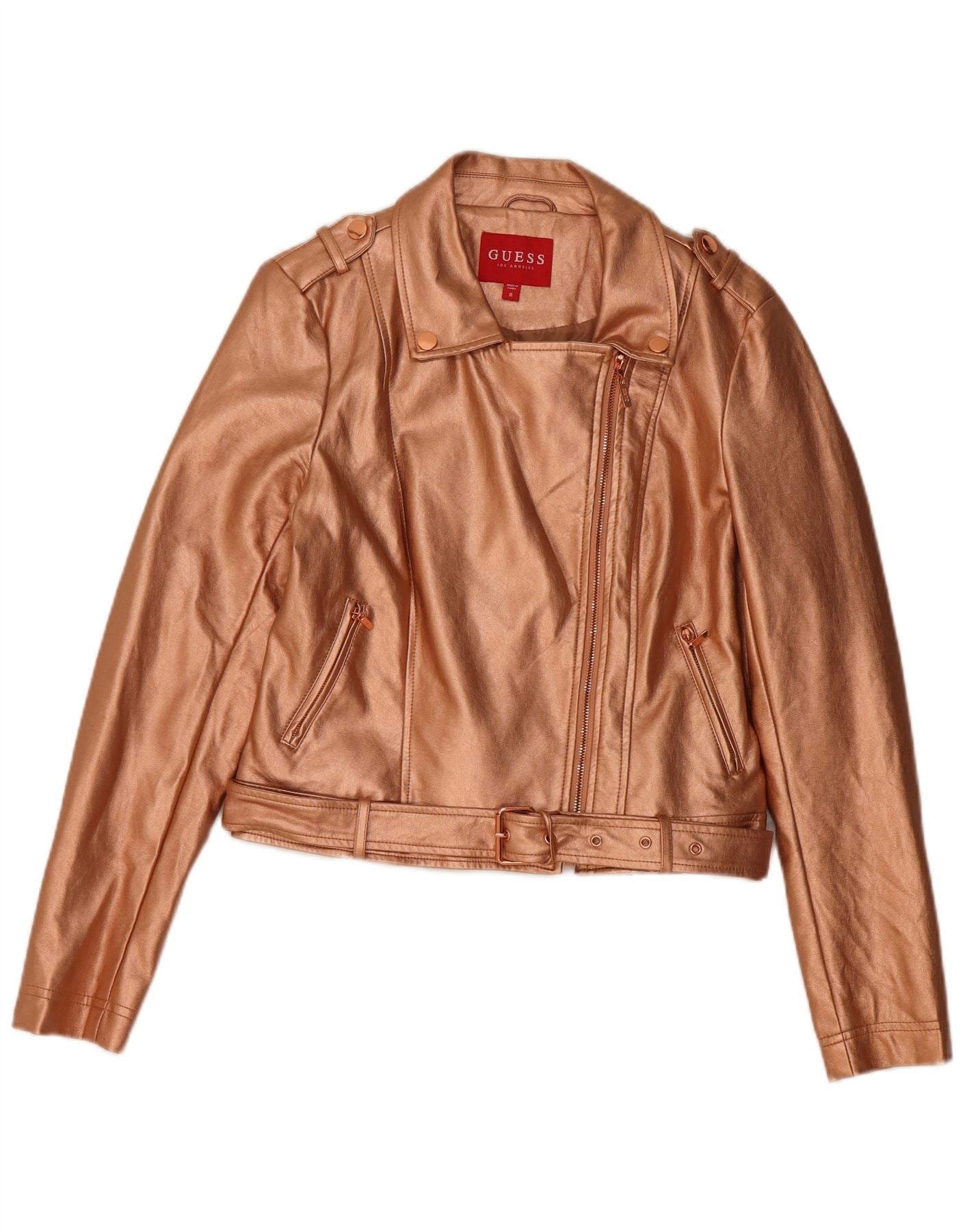 GUESS Veste de motard courte en similicuir pour femme UK 12, polyuréthane doré moyen