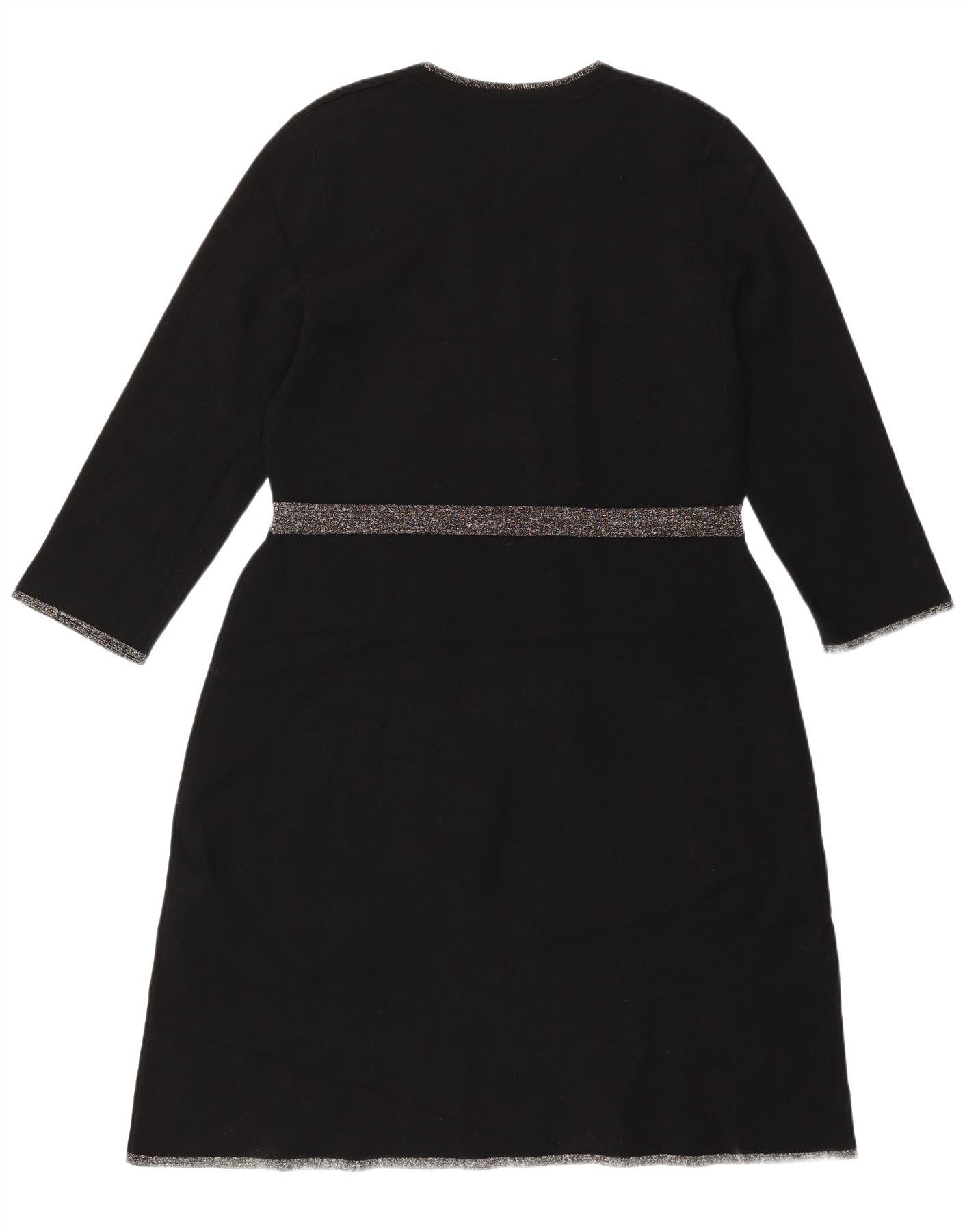 - Description de l'IA : Cette robe droite Hobbs pour femme est confectionnée à partir d'un tissu tricoté en viscose noir doux. Il présente une encolure ronde classique et d'élégantes manches 3/4. De subtils détails pailletés ornent l'encolure, les poignets et la taille, ajoutant une touche d'éclat. La coupe régulière offre une silhouette confortable et flatteuse. Cette robe pull allie confort et style sophistiqué, parfaite pour diverses occasions.