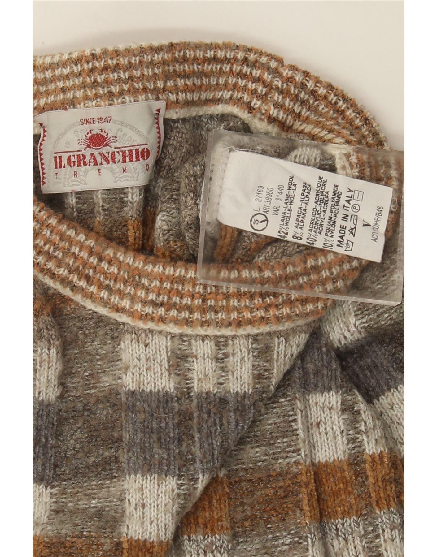 - Description de l'IA : Ce pull à col rond pour homme Il Granchio est confectionné dans un mélange de laine doux. Il présente un motif à carreaux marron classique avec des tons gris et beige. L'encolure ronde et les manches longues offrent une coupe intemporelle et confortable. Sa coupe régulière assure une liberté de mouvement. Ce style pull apporte chaleur et une touche de charme rétro.