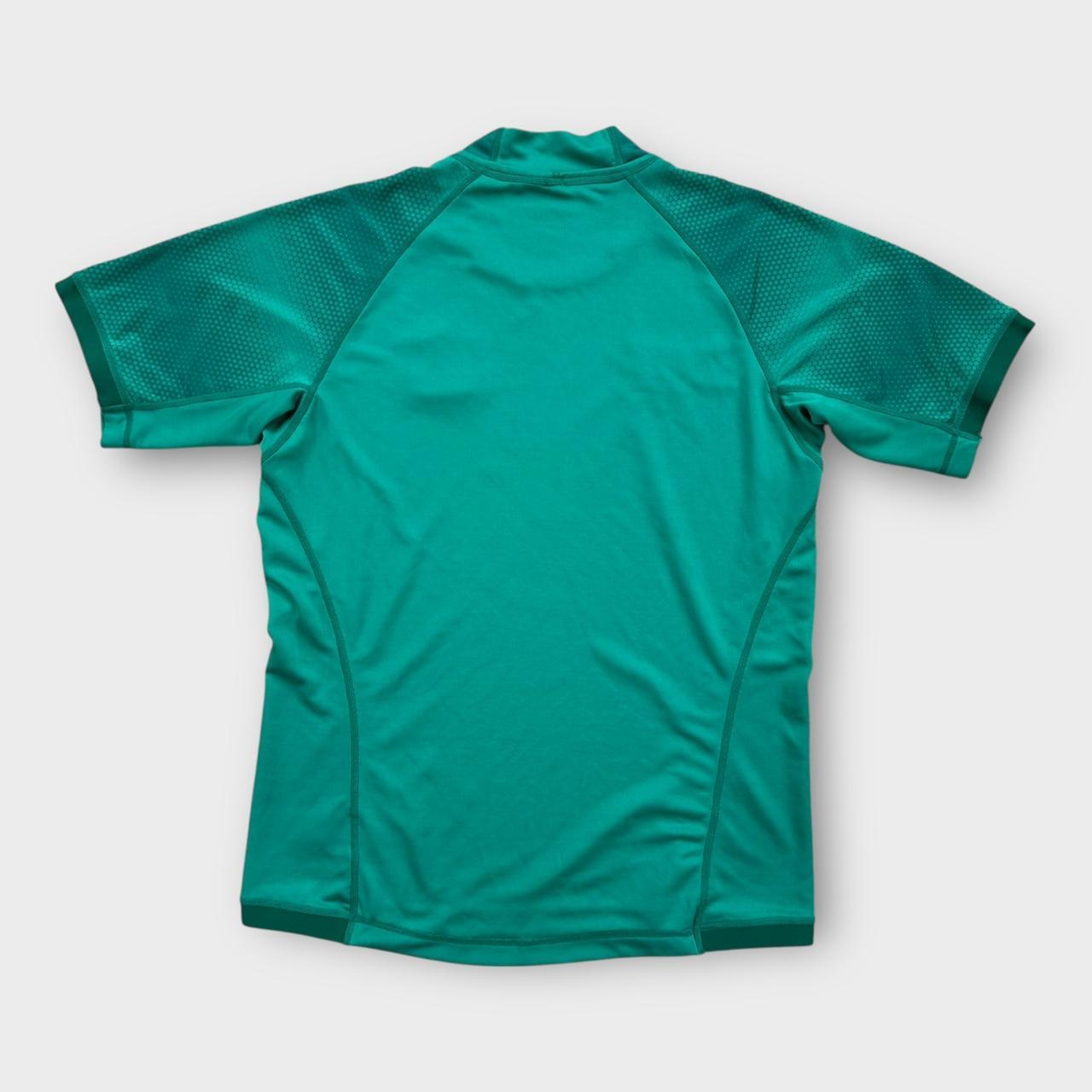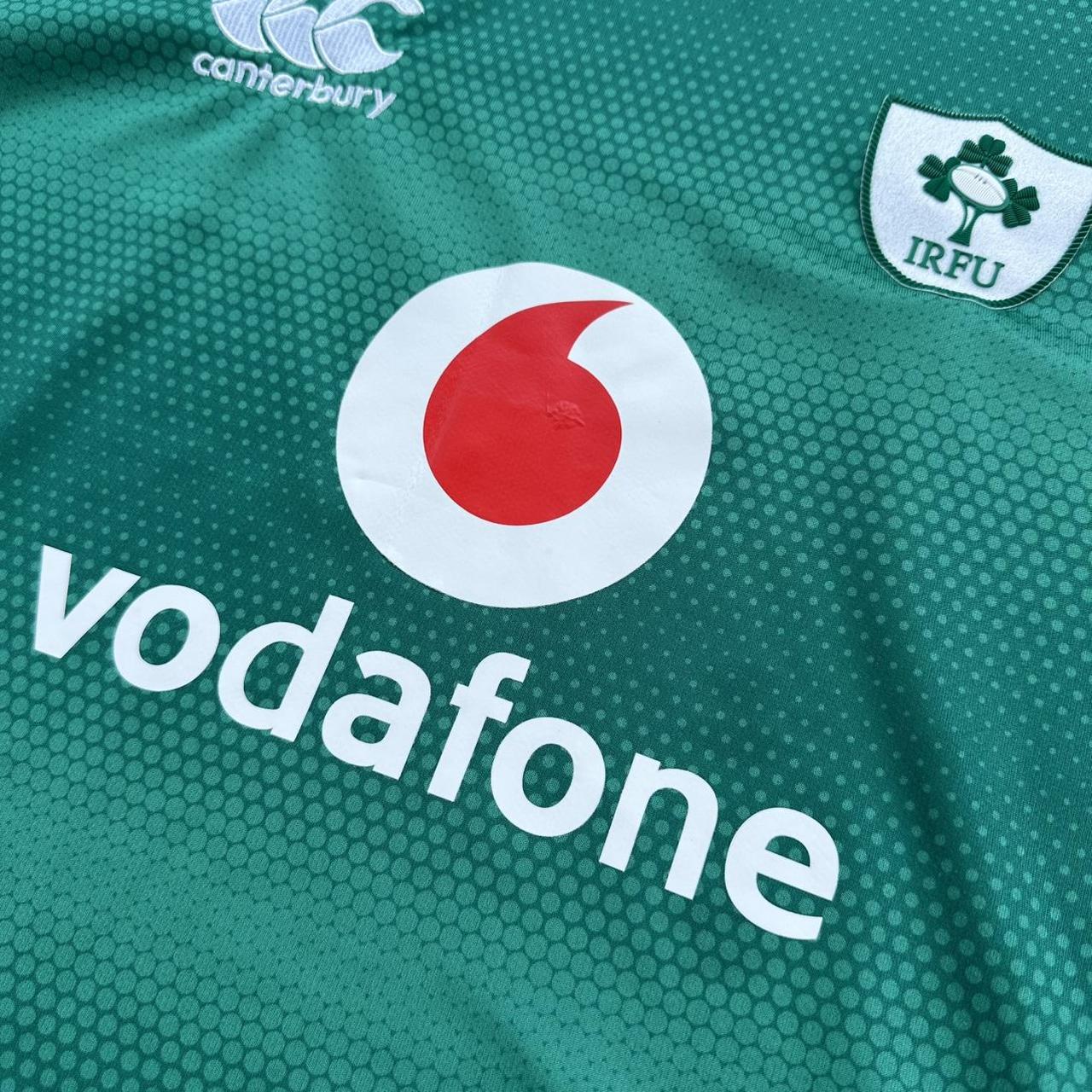 Haut de rugby irlandais de Canterbury en vert avec logos brodés et sponsor Vodafone sur la poitrine