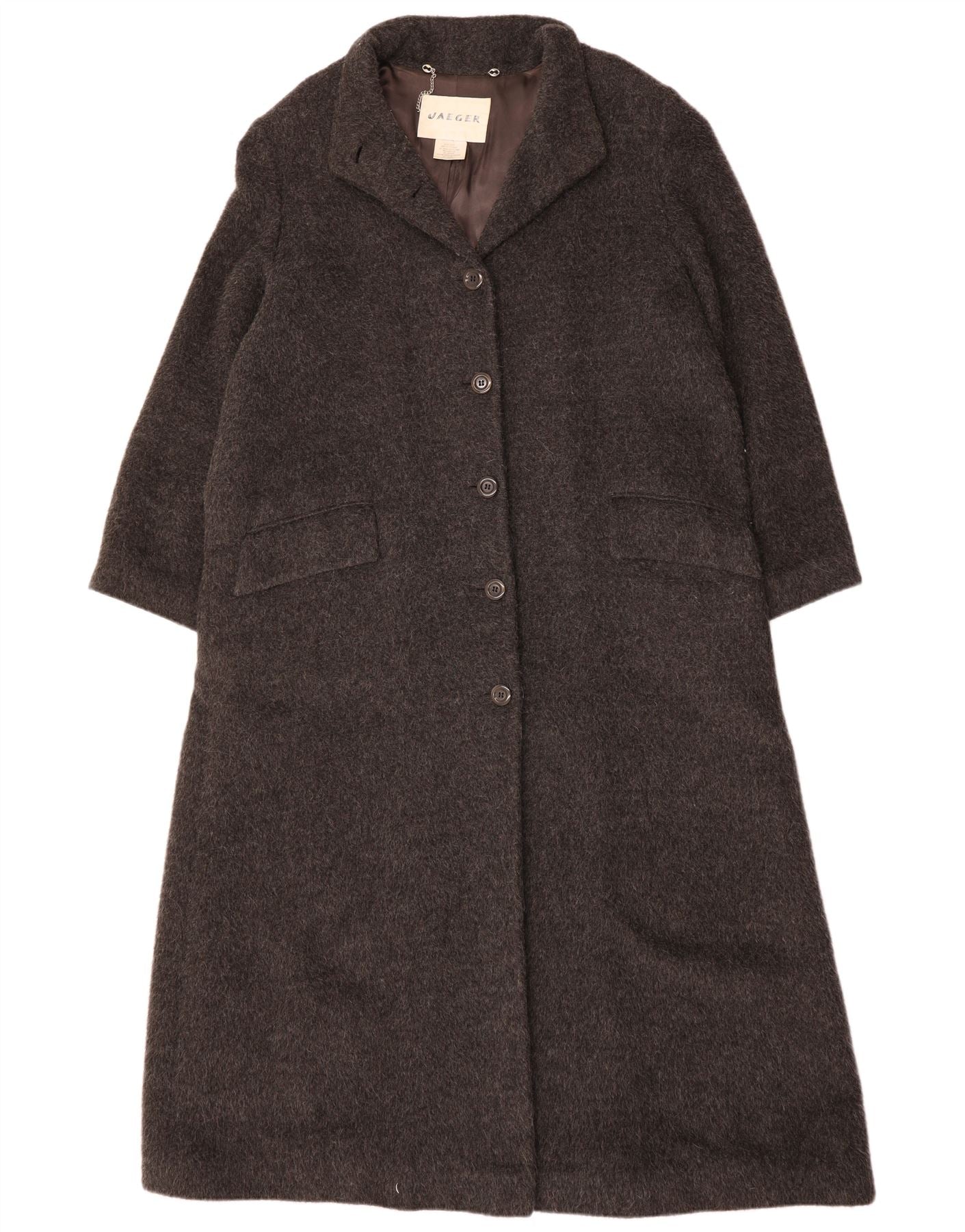 - AI Description: This Jaeger womens coat is crafted from a premium grey woven wool, offering a refined texture. It features a classic collared neckline and a regular fit for timeless appeal. The 3/4 length sleeves provide a sophisticated silhouette. Button closures secure the front, complemented by practical pockets. This piece embodies classic style with elegant detailing.