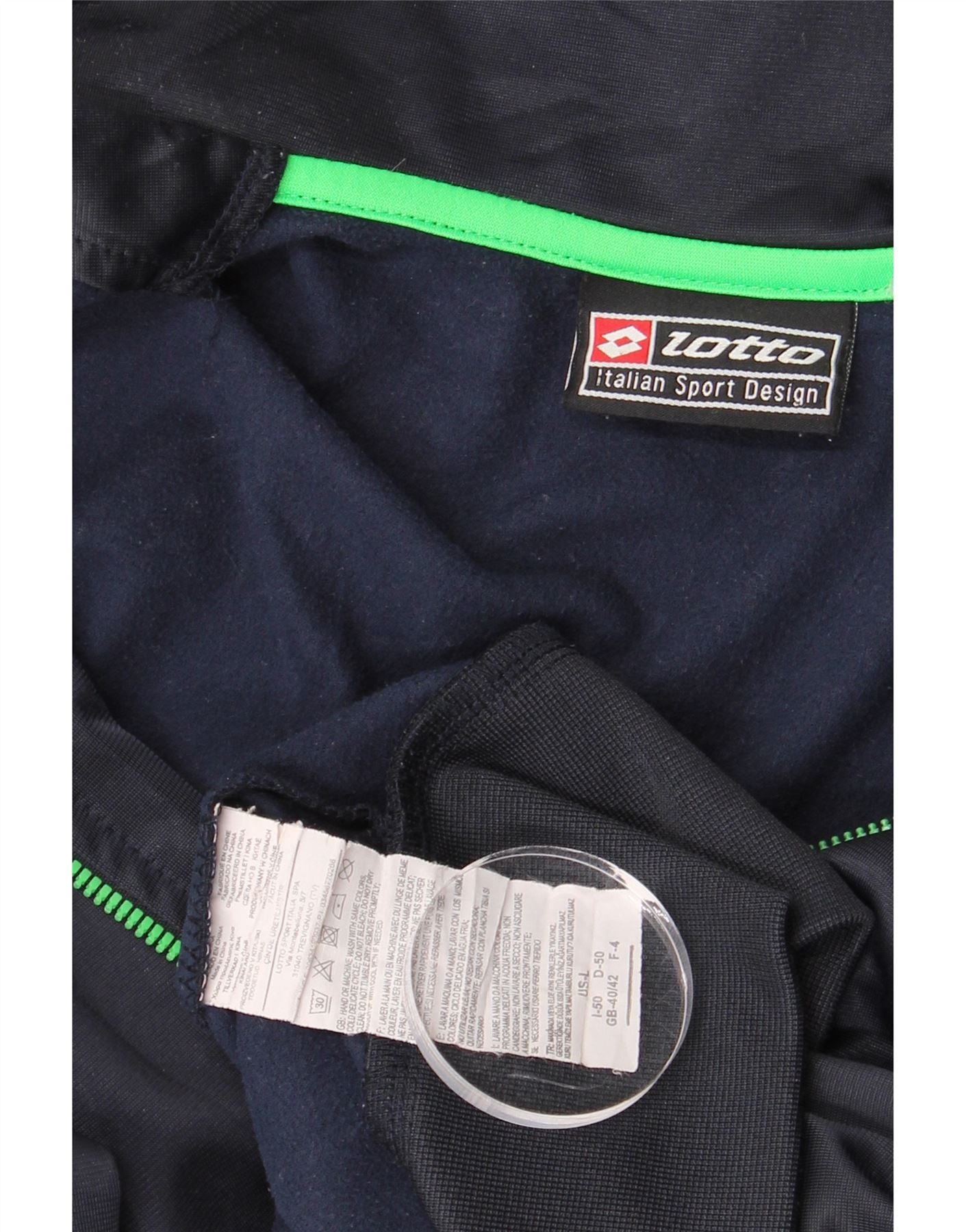 - Description de l'IA : Cette veste de survêtement Lotto pour homme est confectionnée en jersey de polyester lisse bleu marine. Il présente une encolure à col et une fermeture à glissière complète dans un accent vert vif. Les manches longues et la coupe athlétique assurent confort et mouvement. La veste comprend des poches pratiques et un détail graphique subtil sur la manche. Ce design offre une esthétique à la fois sportive et raffinée.