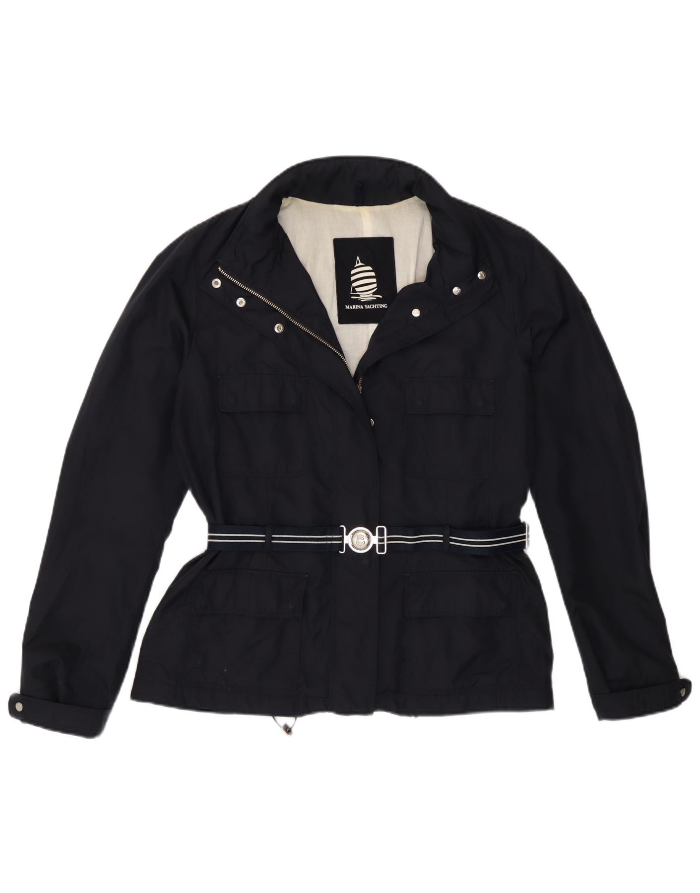 - Description de l'IA : Cette veste pour femme Marina Yachting est confectionnée à partir d'un tissu mélangé de polyester bleu marine durable, offrant une texture lisse et raffinée. Il présente une encolure classique et des manches longues. Une fermeture éclair complète offre un devant propre. La coupe régulière est élégamment définie par une taille ceinturée distinctive avec une boucle élégante. Les poches pratiques ajoutent de la fonctionnalité. La veste est entièrement doublée pour plus de confort, incarnant un style nautique sophistiqué.
