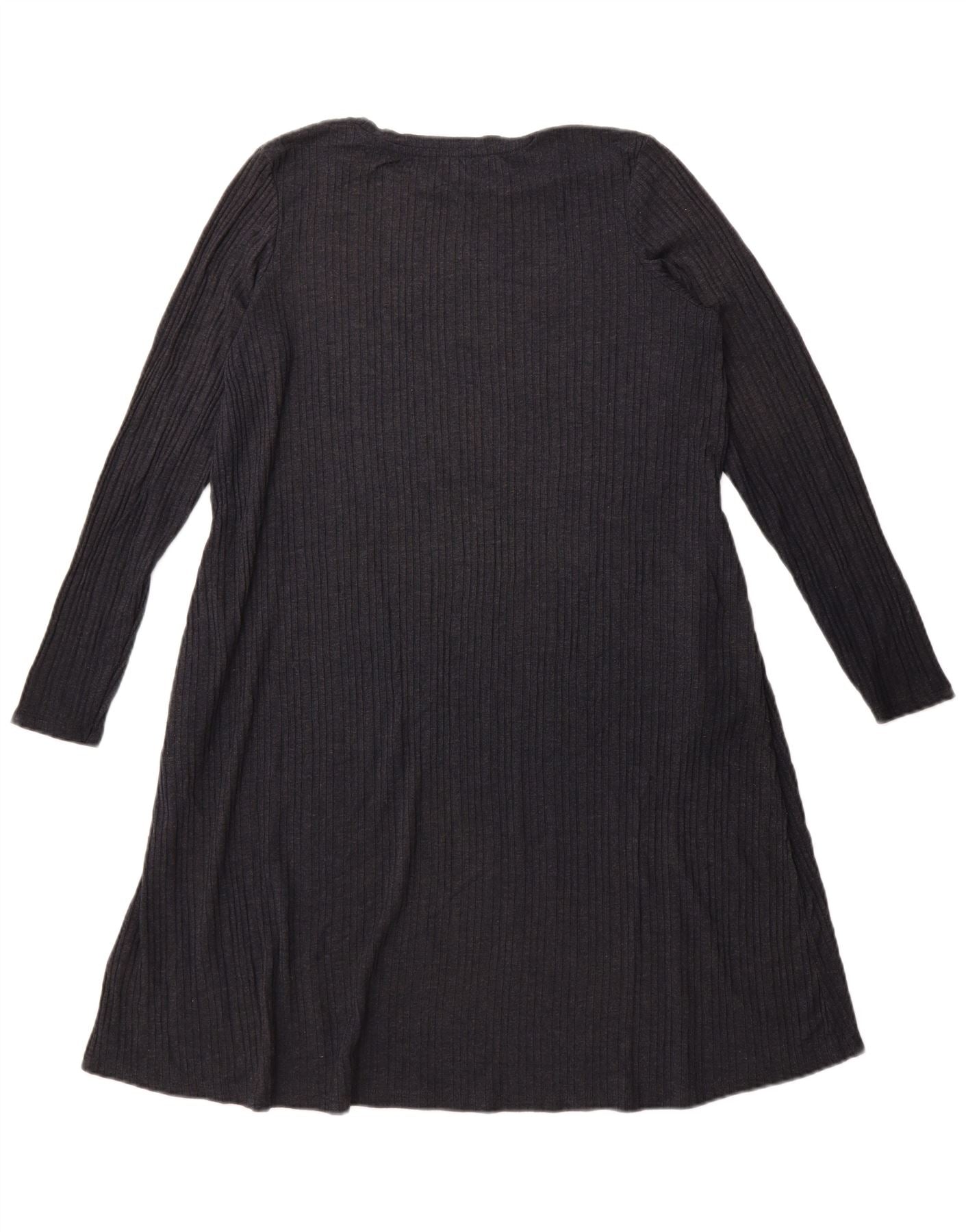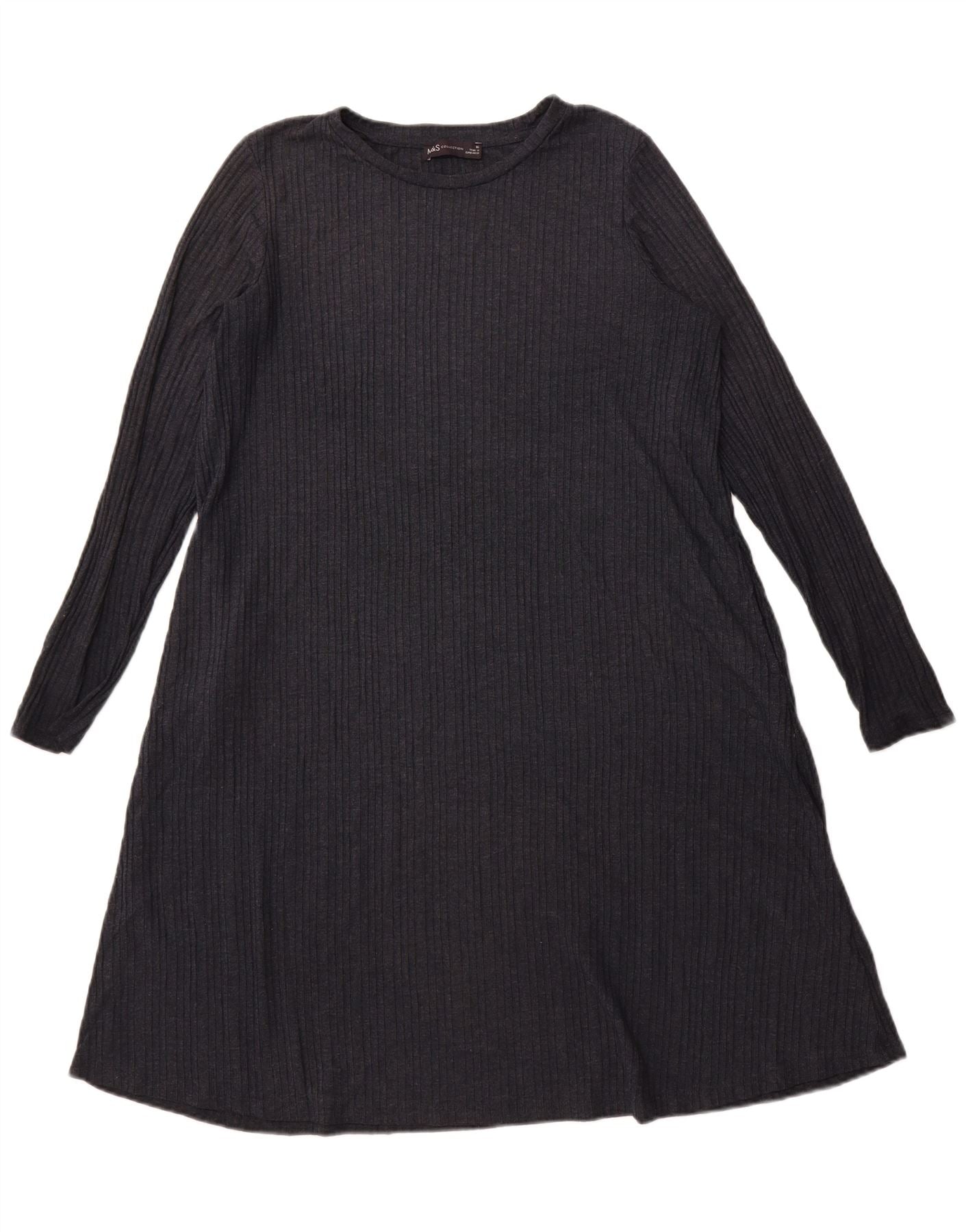 - Description de l'IA : Cette robe trapèze Marks & Spencer pour femme est confectionnée dans un tissu tricoté côtelé gris confortable. Le mélange de polyester et de viscose offre un toucher doux et extensible pour plus de facilité. Il présente une encolure ronde classique et des manches longues. La coupe décontractée s'évase doucement en une silhouette trapèze, assurant confort et un drapé flatteur. Ce style de pull est simple mais élégant.