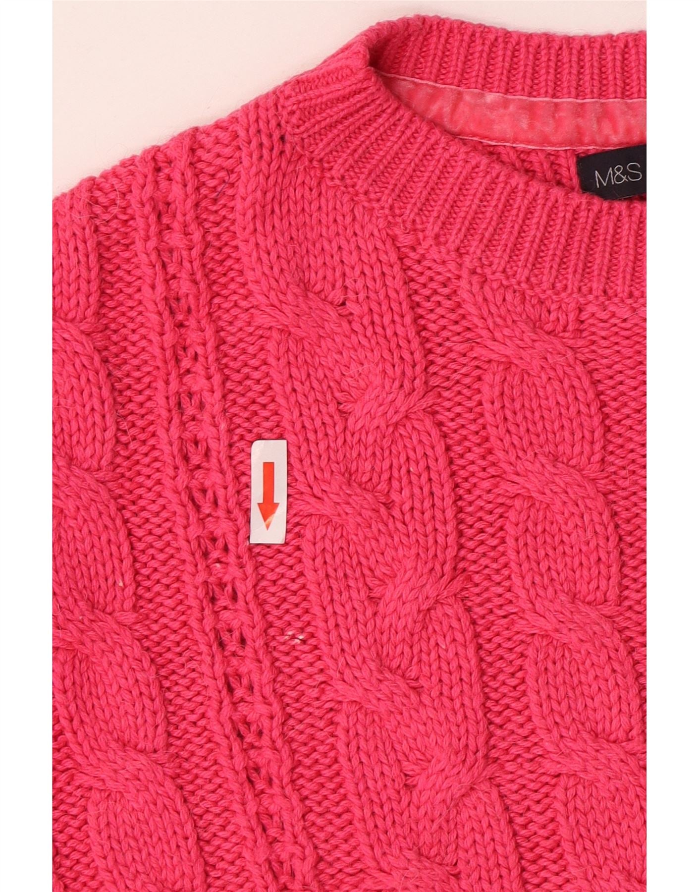 - Description de l'IA : Ce pull pour femme Marks and Spencer est confectionné dans un tissu tricoté rose confortable. Il présente un col rond classique et des manches longues à revers. Le motif en tricot torsadé ajoute une texture riche et un intérêt visuel au devant. Sa coupe régulière et son style pull assurent une grande facilité de port. Les détails asymétriques apportent une touche moderne à ce vêtement douillet.