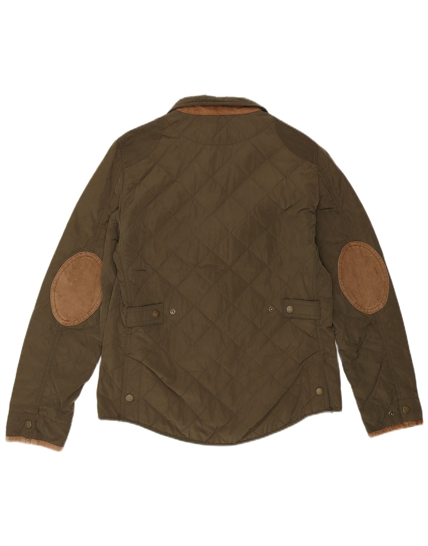- Description de l'IA : Cette veste matelassée pour femme Massimo Dutti est confectionnée à partir d'un tissu vert tissé, offrant une teinte kaki classique. Sa texture matelassée apporte chaleur et profondeur visuelle. L'encolure et les manches longues sont ornées d'une élégante bordure en daim. Une fermeture entièrement boutonnée sécurise le devant, complétée par des poches avant pratiques. Les coudières en daim ajoutent un détail raffiné. La coupe régulière assure un port confortable.