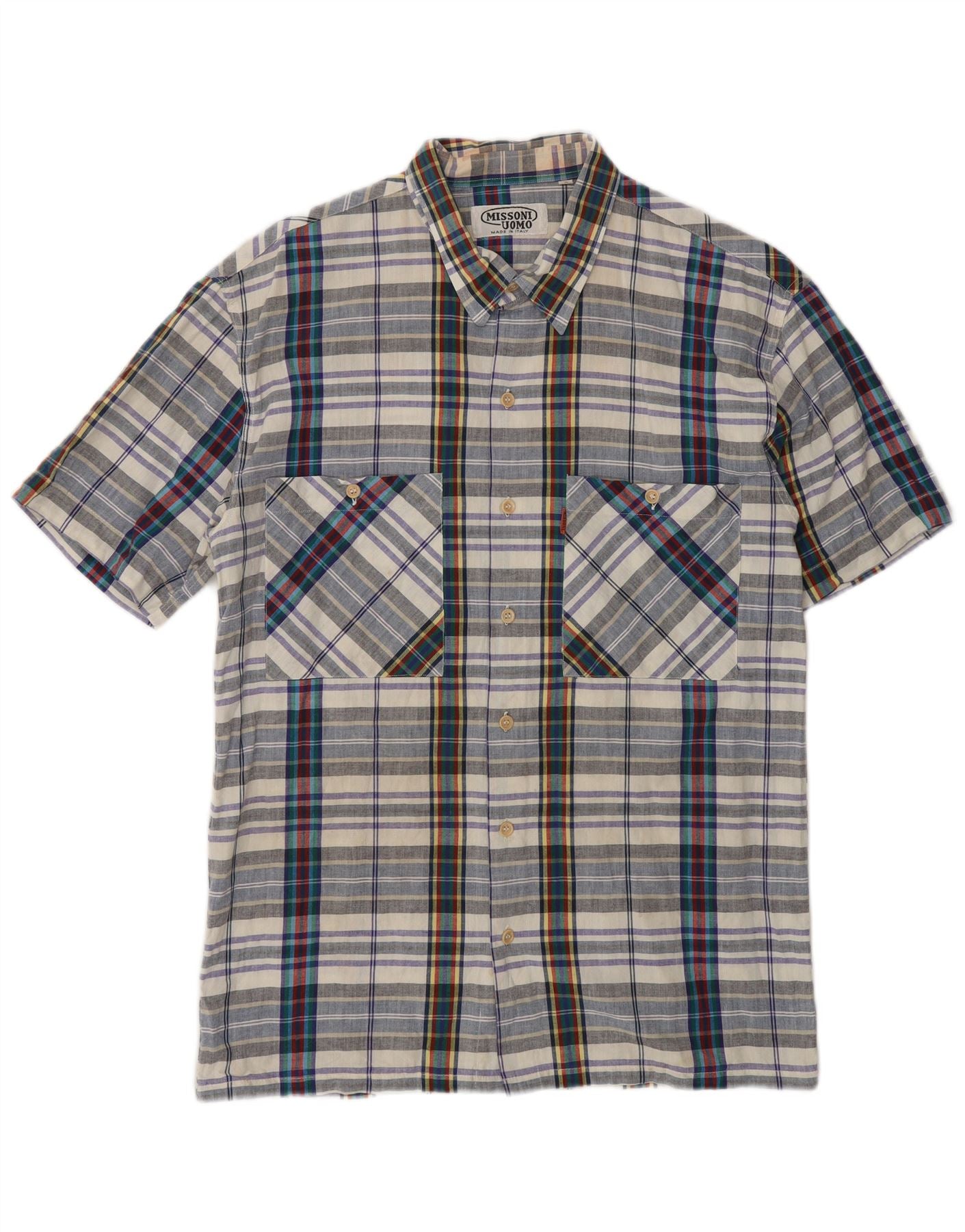 - Description de l'IA : Cette chemise pour homme Missoni Uomo est confectionnée à partir de tissu tissé 100 % coton, offrant une sensation de confort. Il présente un motif à carreaux multicolore vibrant, mélangeant des tons blanc, bleu, rouge, gris, jaune et vert. L'encolure à col et le devant boutonné offrent un look classique. Les manches courtes et la coupe régulière assurent un port facile. Deux poches poitrine ajoutent des détails pratiques au design, complétant cette pièce élégante.