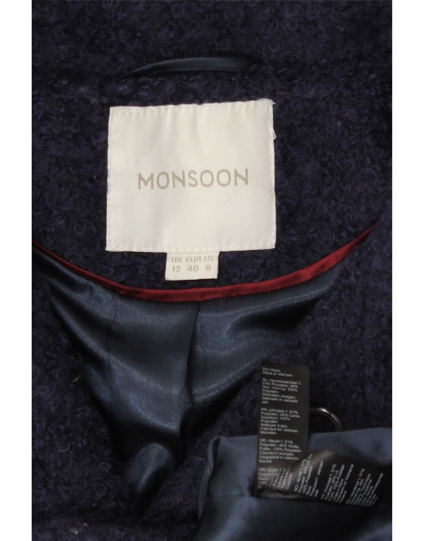 - Description de l'IA : Ce manteau Monsoon pour femme est confectionné à partir d'un riche mélange acrylique bleu marine, présentant une texture bouclée distinctive. Il présente une encolure collée et des manches longues, offrant une silhouette hivernale classique. La coupe régulière assure un port confortable. Les fermetures à pression dissimulées offrent un devant élégant. Des poches pratiques sont intégrées et le manteau est entièrement doublé pour plus de chaleur. Les boutons ton sur ton ajoutent un accent subtil.