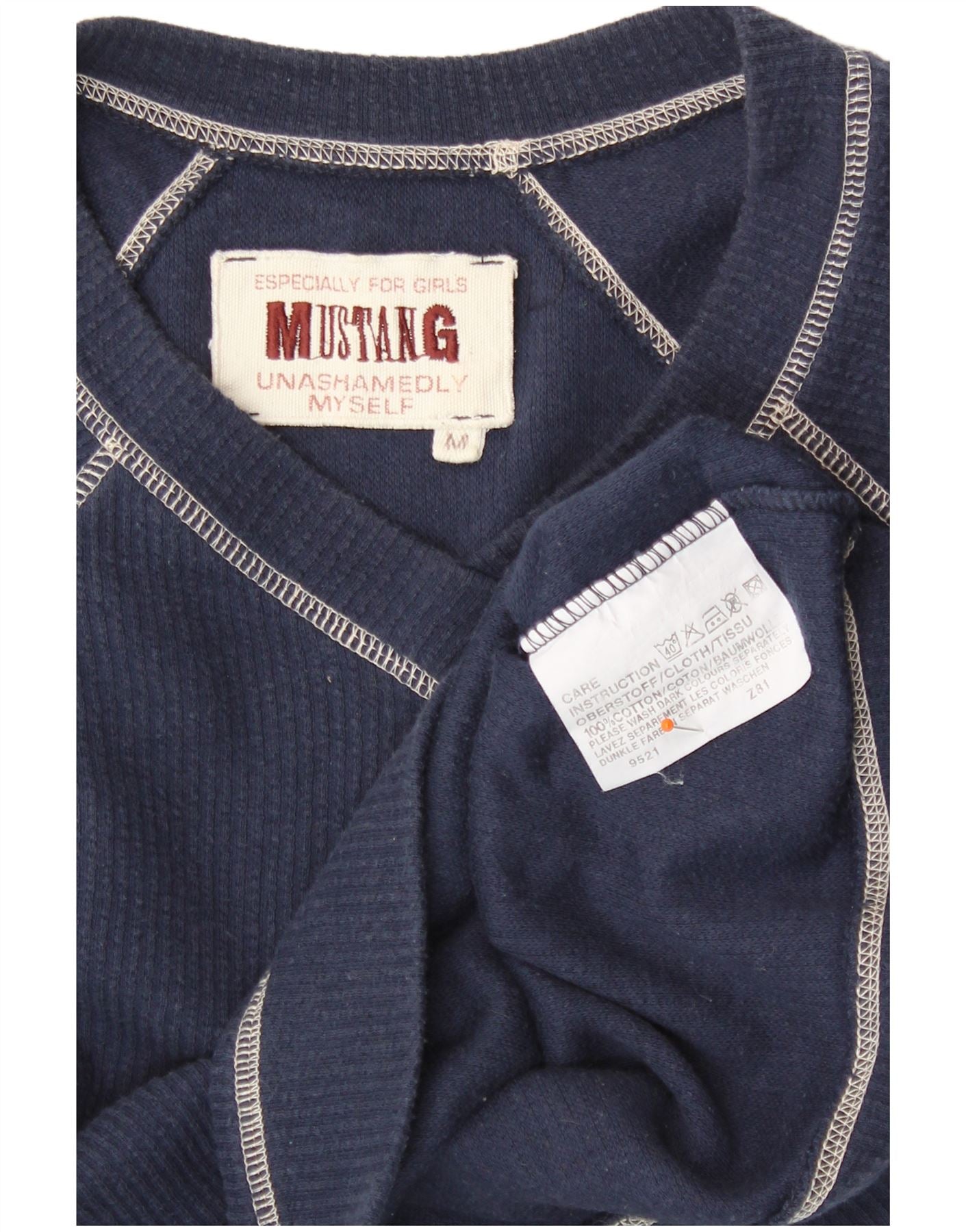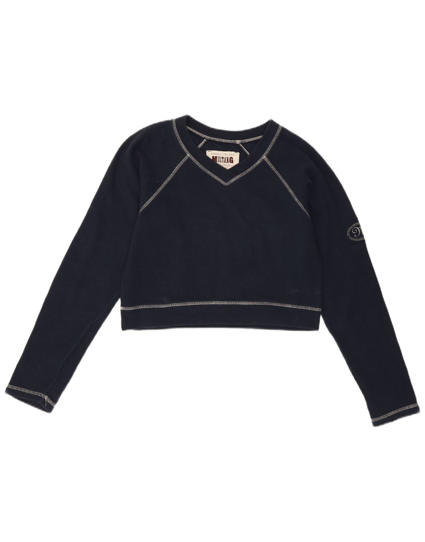 - AI Description: This Mustang womens V-Neck Jumper Sweater is crafted from 100 percent cotton knit for a soft, comfortable feel. It features a classic V-neckline and long sleeves. The regular fit is complemented by a modern crop length. A subtle embroidered detail adds a refined touch. This pullover style offers effortless wear in a versatile navy blue.
