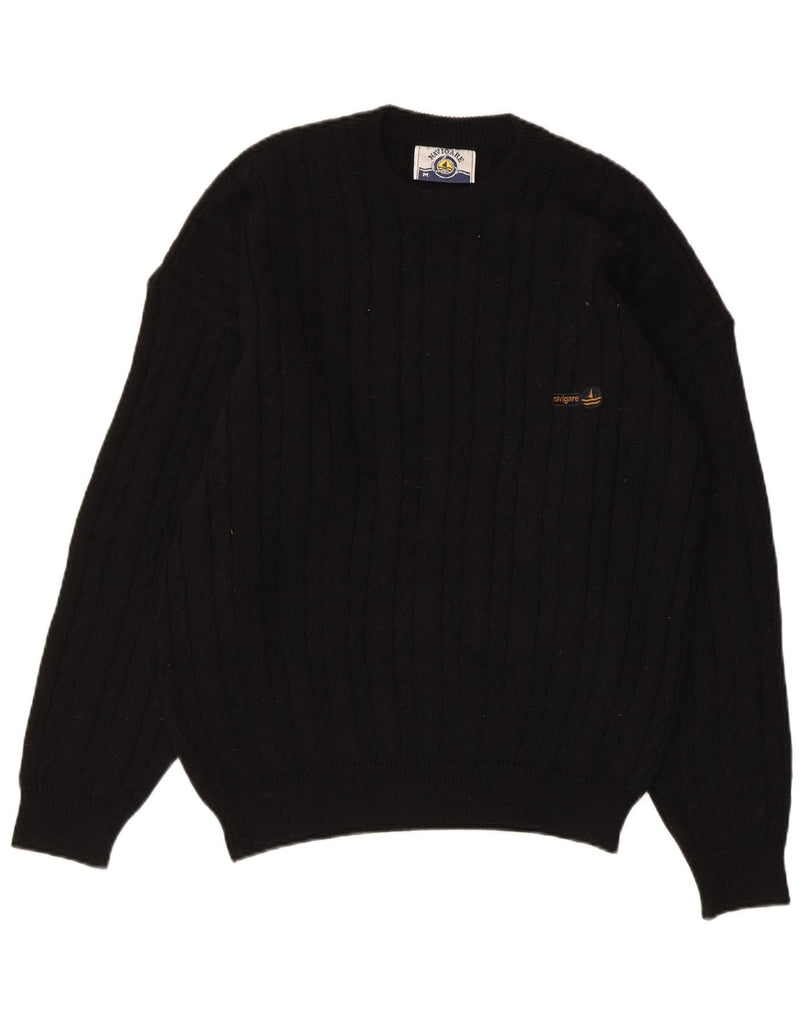 - AI Description: This Navigare mens crew neck jumper sweater is crafted from luxurious 100 percent wool knit. Its deep black hue offers timeless versatility and a soft feel. The classic round neck and long sleeves provide a comfortable, regular fit. A subtle branded logo adds a refined nautical touch. This pullover design ensures effortless wear, perfect for smart casual layering.