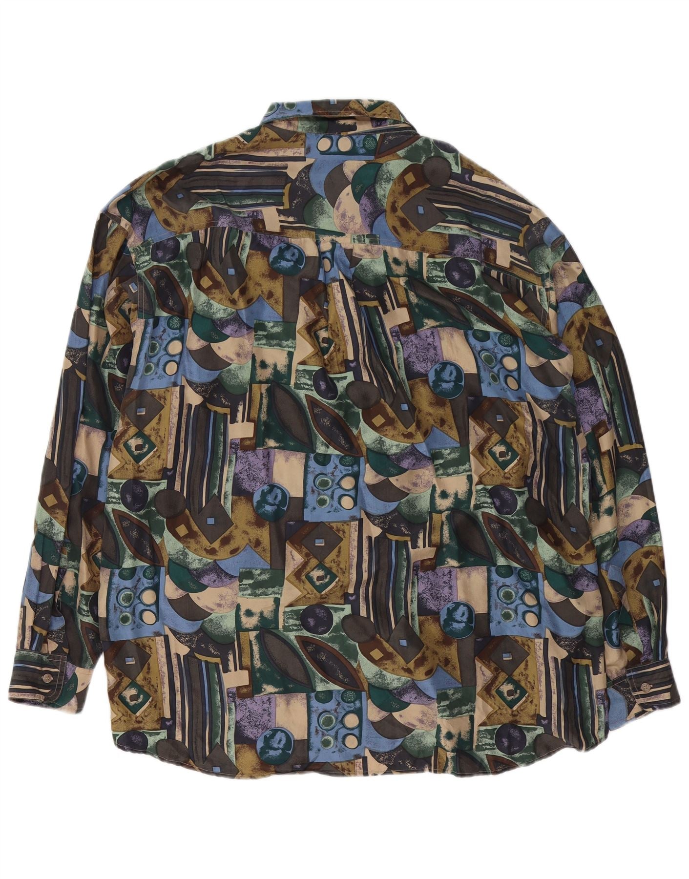- Description de l'IA : Cette chemise pour homme C&A est confectionnée à 100 % en soie luxueuse, offrant une texture lisse et tissée. Il présente un motif géométrique multicolore vibrant, lui conférant un style distinctif des années 90. L'encolure à col et le devant entièrement boutonné offrent une structure classique. Les manches longues et la coupe décontractée assurent un port confortable. Des poches pratiques ajoutent des détails fonctionnels à ce vêtement accrocheur.