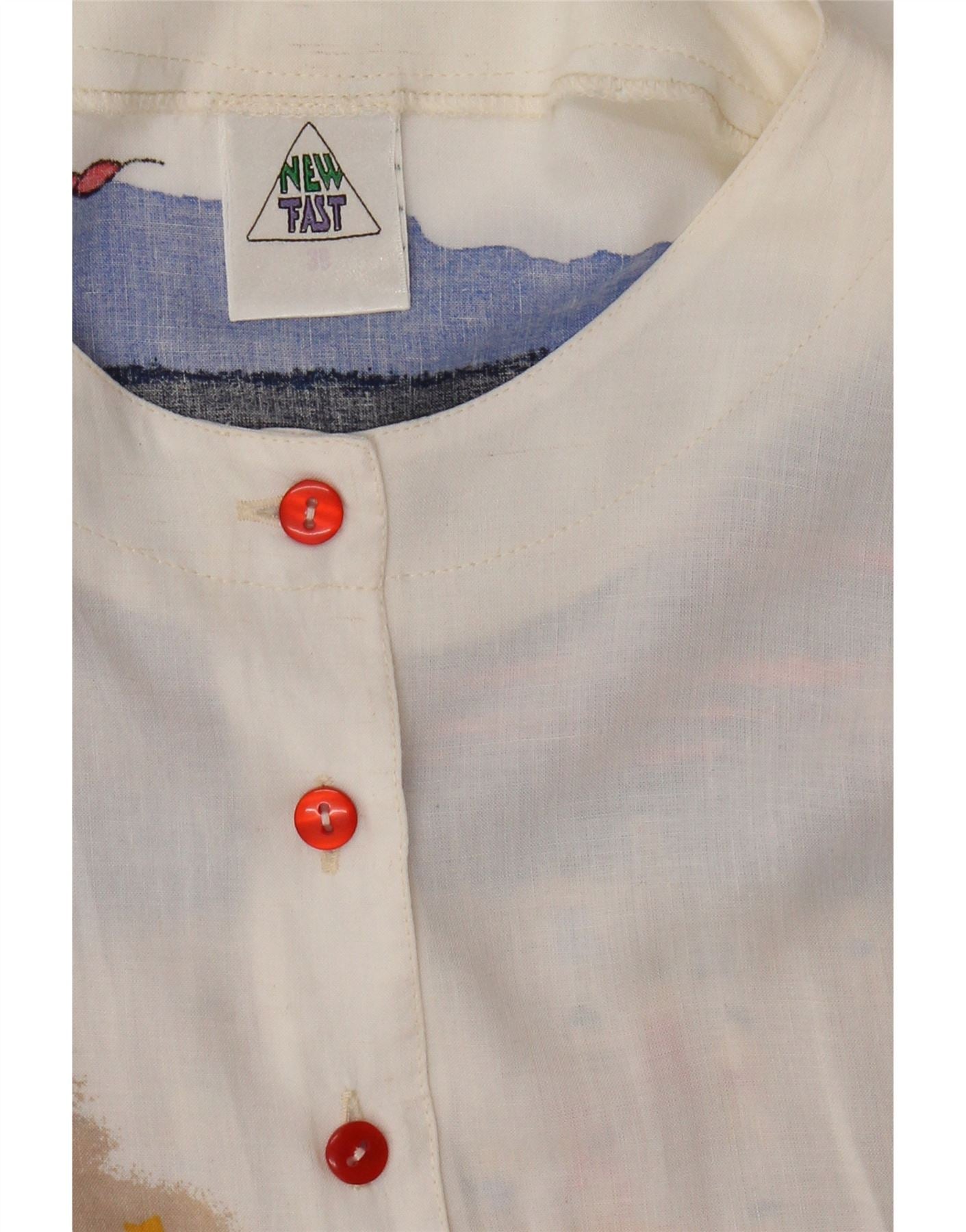 - Description de l'IA : Ce chemisier chemise New Fast pour femme est confectionné dans un tissu tissé léger dans une teinte blanc cassé. Il présente une encolure collée et des manches courtes. La coupe décontractée et ample assure le confort et une silhouette aérée. Un imprimé graphique vibrant représentant une scène de plage orne le devant et le dos. Les boutons rouge vif apportent un accent saisissant sur la fermeture avant.
