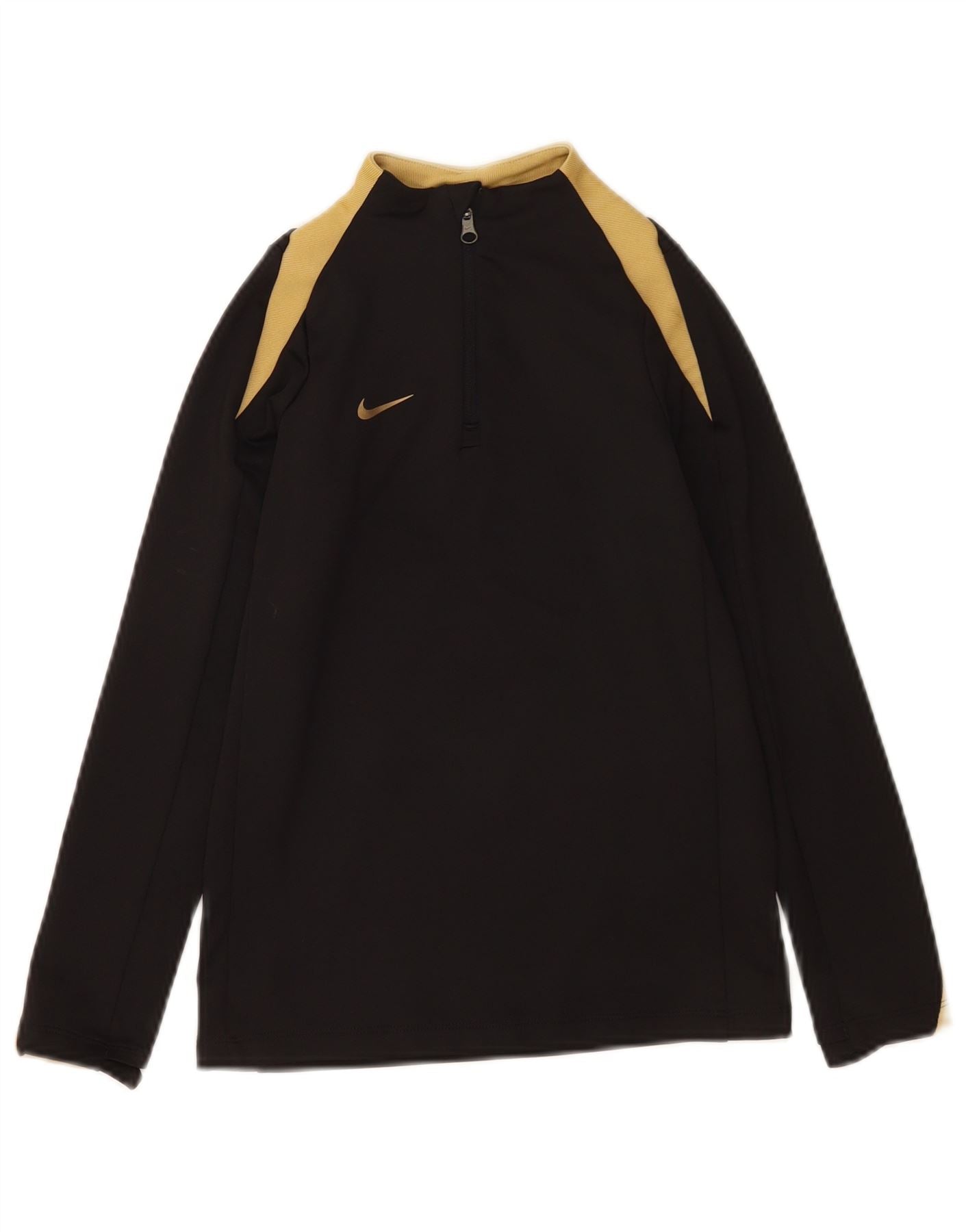 - Description de l'IA : Ce haut de survêtement Nike pour garçon est confectionné en jersey de polyester noir respirant. Le tissu lisse assure confort et coupe ajustée. Il présente un col montant et des manches longues. Un motif color block doré accentue les épaules et le col. La fermeture éclair 1/4 offre une ventilation réglable. Un subtil logo Nike ajoute une touche signature. Ce haut de sport est idéal pour les vêtements actifs.