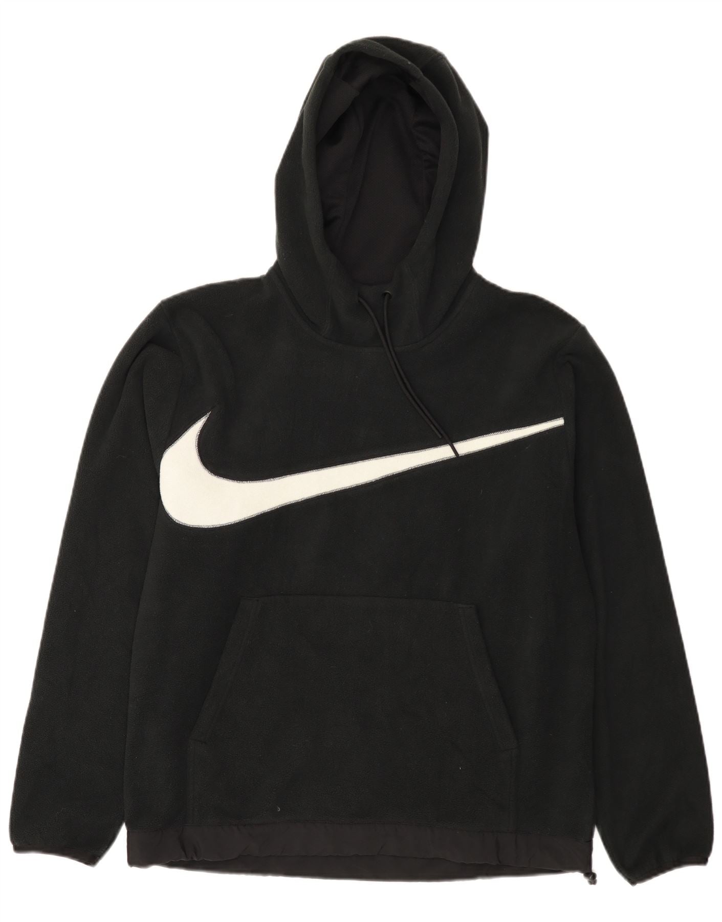 - Description de l'IA : Ce pull à capuche Nike pour homme est confectionné en polaire de polyester noir doux. Il présente une coupe régulière confortable et des manches longues. La conception du pull comprend une capuche réglable pour plus de chaleur. Une poche kangourou pratique se trouve sur le devant. Un logo Nike Swoosh blanc proéminent orne la poitrine, ajoutant un détail graphique audacieux. Ce style sportif offre à la fois confort et logo emblématique.
