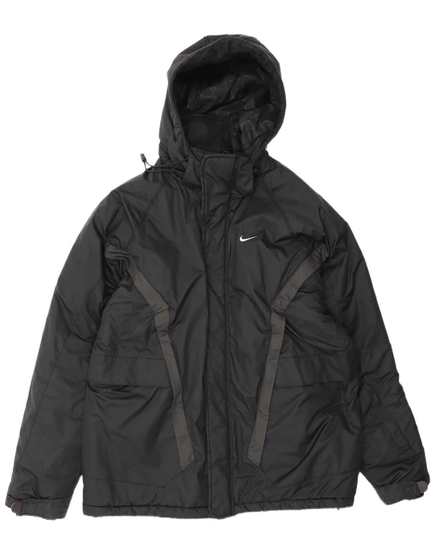 - AI Description: This Nike mens padded jacket offers warmth and protection in a classic black finish. Crafted from a woven fabric with insulation, it provides a comfortable regular fit. The collared neckline and full zip closure ensure a secure feel. It features a practical hood, multiple pockets, and is windproof for outdoor activities. A subtle logo accent completes the design.